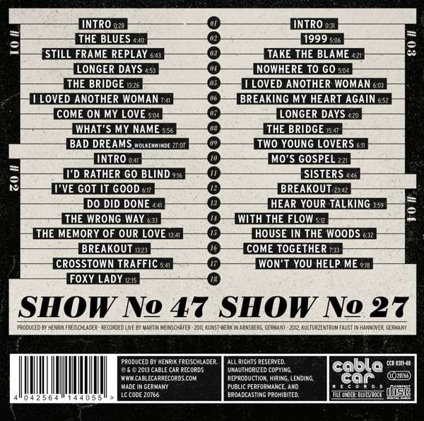 Und heute? Mit dieser seiner Band ist er in Europa meiner Meinung nach mittlerweile in einem Qualitätsbereich gelandet, der weiteren kreativen Höhenflügen Tür und Tor öffnet. „Alte“ und „neue“ Kracher aus dem Bandrepertoire geben sich in den knapp 260 Minuten Laufzeit die Klinke in die Hände, fünf Coverversionen von „Etta James“ und der Herren „Green, Hendrix und Lennon/McCartney“ lockern die Playlisten auf. Die „HFB“, Betonung auf das B wie Band, schnurrt los mit „The Blues“, von der ersten, gleichnamigen CD.