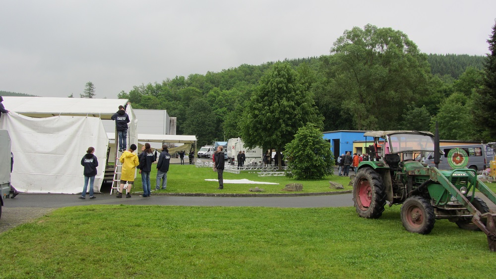 Im letzten Jahr sind einige Helfer zu kurz vor dem Festival abgesprungen. Meine Befürchtungen, dass auch dieses Jahr darunter leiden könnte, zerstreuen sich beim ersten Blick über das Gelände. An der großen Bühne werkeln routiniert Leute, die nicht in den blauen und roten Regenjacken mit dem Aufrdruck „Freak Valley Festival Crew“ unterwegs sind. Die kleine Bühne – eine der großen Neuerungen zum letzten Jahr – ist schon vollkommen aufgebaut (wenn auch noch nicht mit Technik ausgestattet). Und von den Mädels und Jungs in den besagten Regenjacken wimmelt es nur so auf dem Gelände: Schon geschäftig, auf der Suche nach Arbeit, rauchend und wartend. Aufgaben gibt es genug, aber eben auch befriedigend viele Helfer!