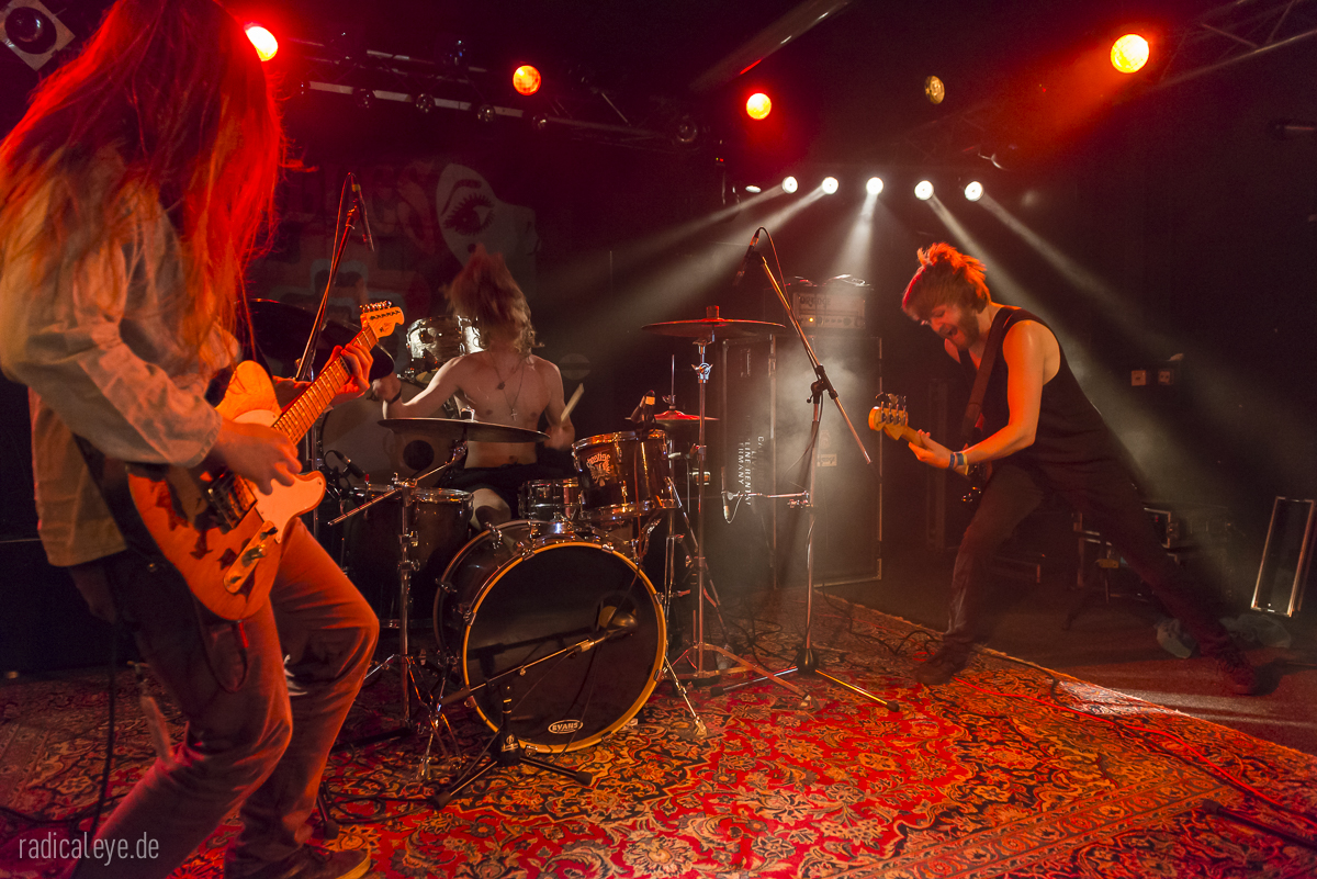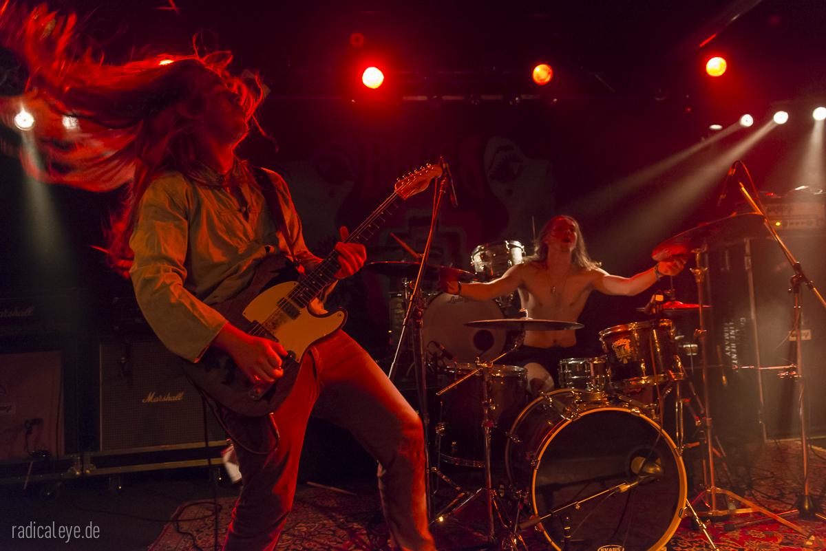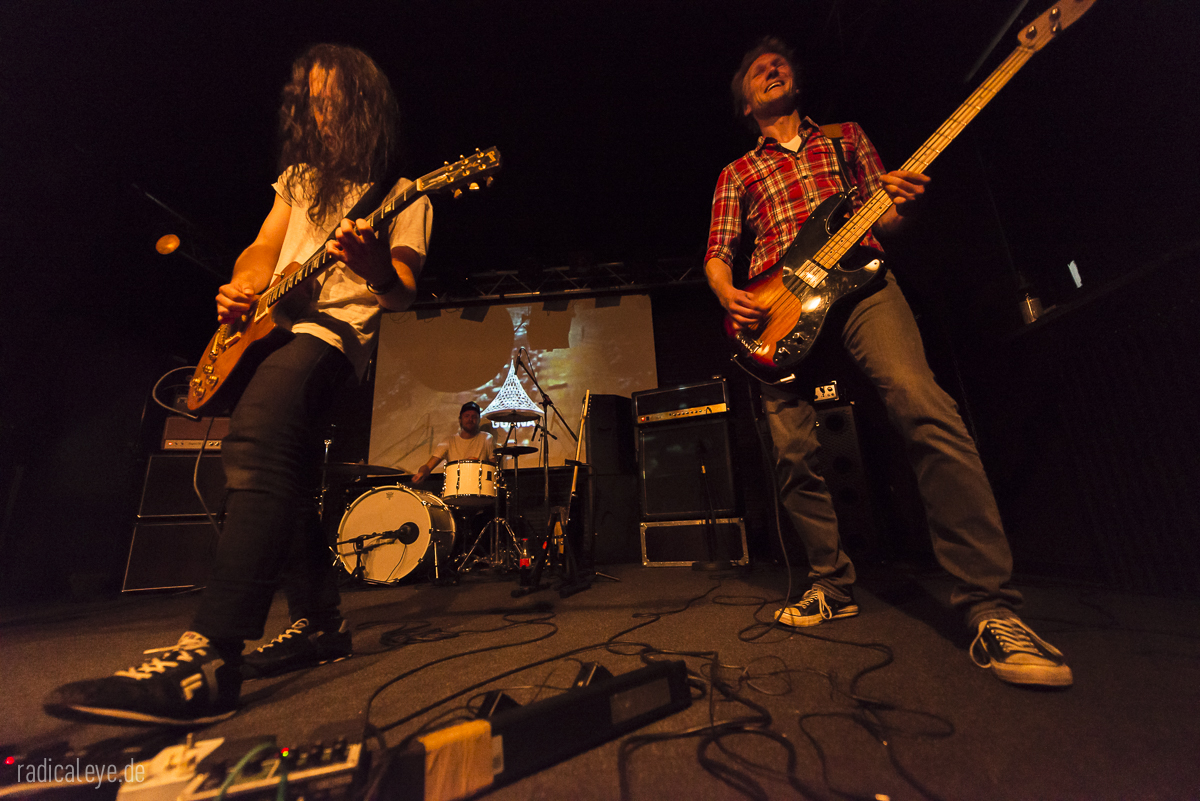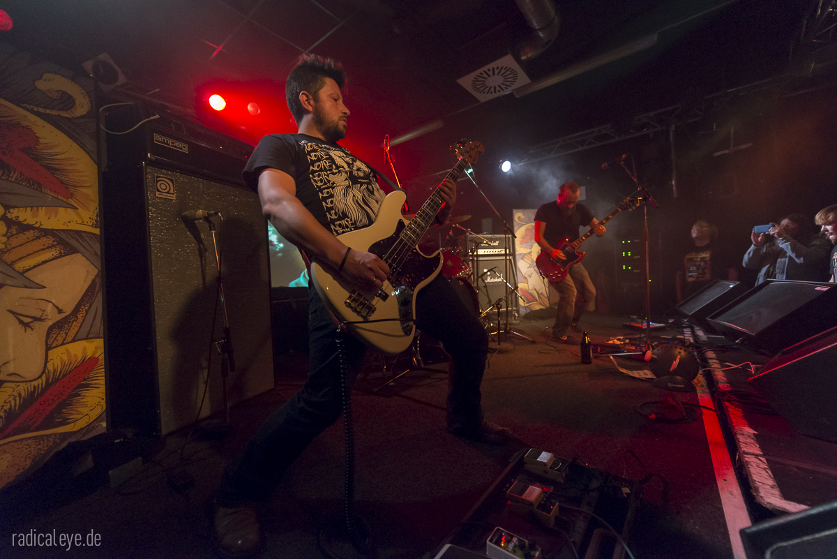 Volkers Senf dazu: Kranhalle, 15 Uhr 30. Aaron Boyer als Dreschflegel und Mister Prügelpeitsch (© Otto Waalkes) unter ihrem Bühnenlogo, Ryan McAllister an den dicken Saiten und Gitarrist und Sänger Ryan Ferrier boten uns einen 45-minütigen Keep It Low Samstagseinstieg der gehobenen Klasse, Stoner Rock mit „Big Balls“. Guter Gesang, bollernder Groove und Zwechfellerschütternde Gitarrenriffs und-licks….wie mit einem Hieb aus Granit gemeißelt. Schweißtreibend, Nackenmalträtierend, Mähnenschüttelnd (bei mir nicht mehr möglich) und immer am Anschlag. Die drei Jungs hatten aber noch mehr im Programm: sie mussten direkt nach diesem Auftritt noch ein paar Meter auf diversen Autobahnen zurücklegen, denn spät am Abend stand noch ein Auftritt im Siegener Vortex an….Respekt!