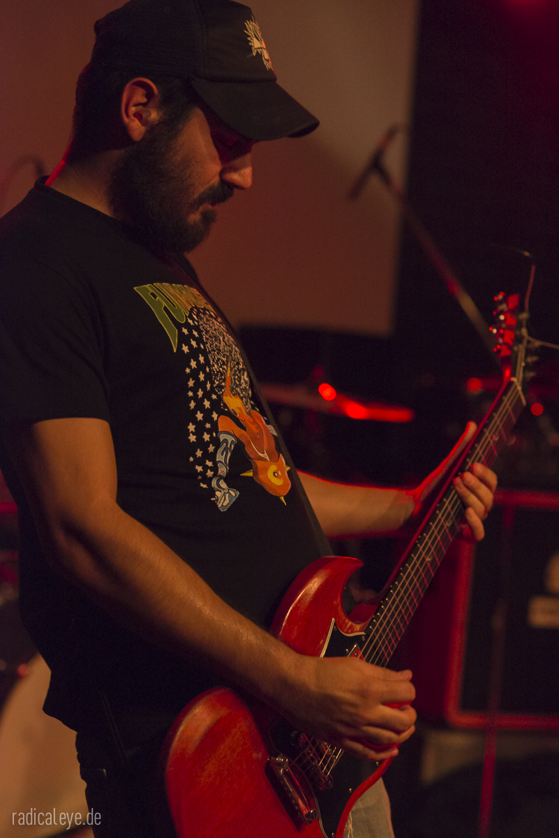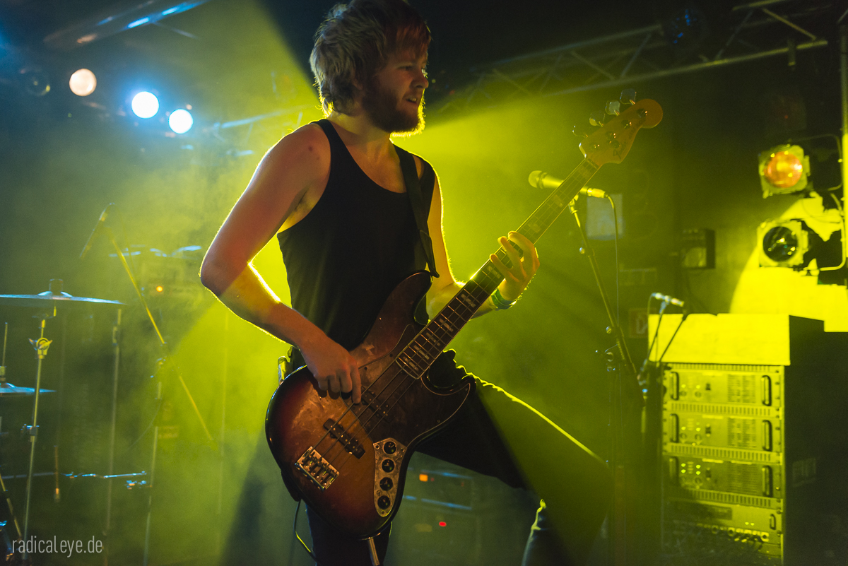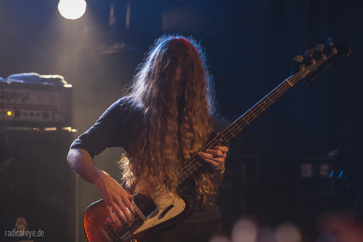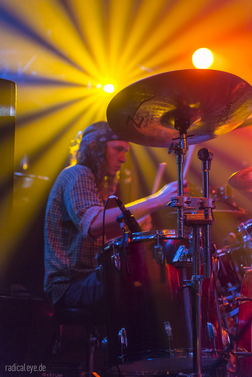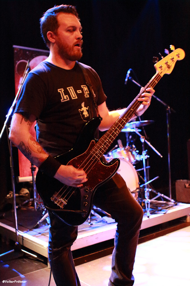Volkers Senf dazu: Kranhalle, 15 Uhr 30. Aaron Boyer als Dreschflegel und Mister Prügelpeitsch (© Otto Waalkes) unter ihrem Bühnenlogo, Ryan McAllister an den dicken Saiten und Gitarrist und Sänger Ryan Ferrier boten uns einen 45-minütigen Keep It Low Samstagseinstieg der gehobenen Klasse, Stoner Rock mit „Big Balls“. Guter Gesang, bollernder Groove und Zwechfellerschütternde Gitarrenriffs und-licks….wie mit einem Hieb aus Granit gemeißelt. Schweißtreibend, Nackenmalträtierend, Mähnenschüttelnd (bei mir nicht mehr möglich) und immer am Anschlag. Die drei Jungs hatten aber noch mehr im Programm: sie mussten direkt nach diesem Auftritt noch ein paar Meter auf diversen Autobahnen zurücklegen, denn spät am Abend stand noch ein Auftritt im Siegener Vortex an….Respekt!