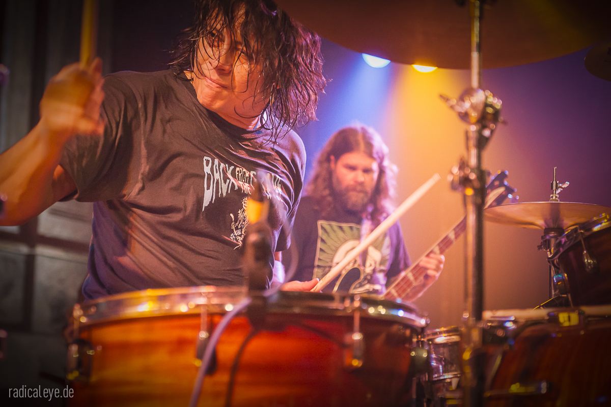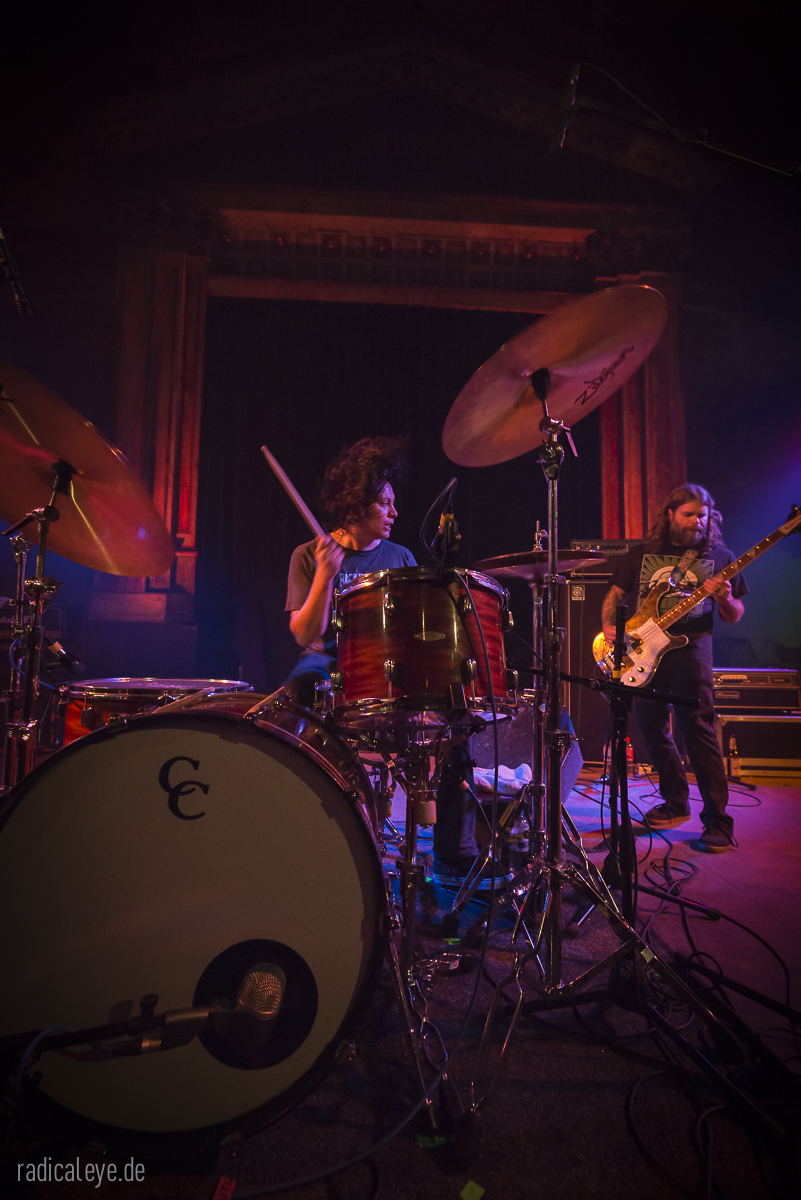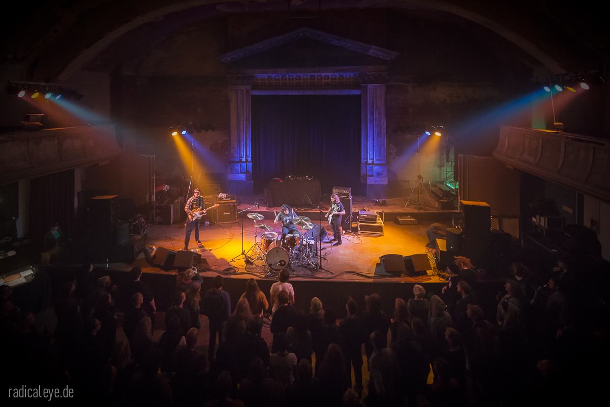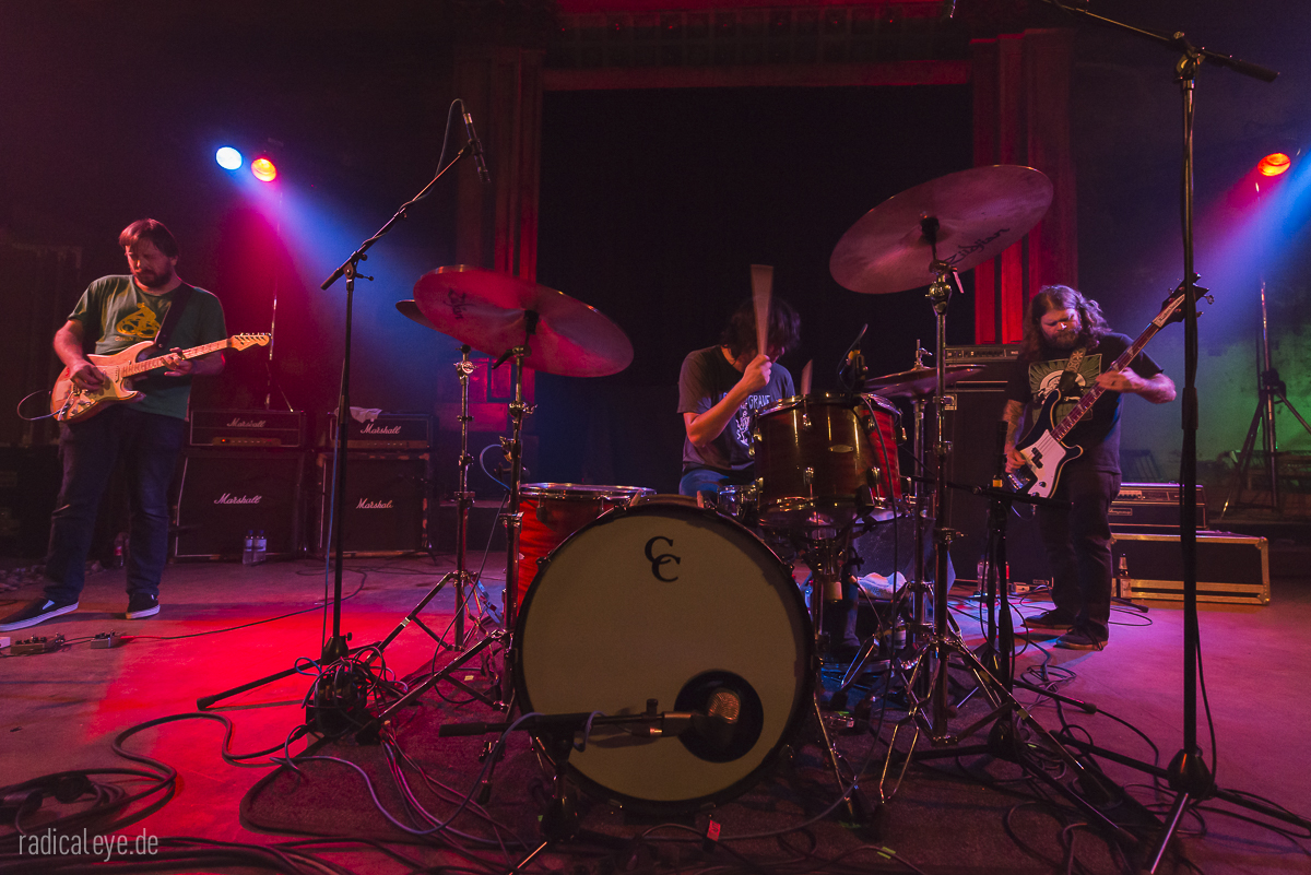 Nach einer kurzen Umbaupause, die mir Gelegenheit gibt, erneut den ungewöhnlichen Platz zu bewundern und von weiteren Fotoshootings zu träumen, entert die lebende Legende EARTHLESS die Bühne… Seit 2001 setzen diese drei Musiker Maßstäbe in Liveperformance und Jamkunst, sind aber bisher über den Geheimtippstatus nie hinaus gekommen. Der Gitarrist Isaiah Mitchell, Basser Mike Eginton und der ehemalige Profiskater Mario Rubacalba am Schlagzeug benennen Krautrock, Black Sabbath, The Who, Motörhead und Psychedelic Rock als ihre maßgeblichen Einflüsse, die sie zu einem irren Mix verschmelzen. Und so ufert bereits der erste Song – wenn man in diesem Zusammenhang überhaupt noch diesen Begriff verwenden kann – zu einer irren Jamsession aus. Rubacalba und Eginton bilden eine der mit Abstand besten Rock-Rhythmussektionen unserer Zeit auf deren Basis Mitchell sich am Bass austoben kann ohne dabei steril oder zu technisch zu klingen. Die Stücke fühlen sich eher wie musikalische Monolithen an, die aus den Gefühlen der Musiker heraus jedes Mal aufs Neue entstehen. So fällt es mir auch schwer, einzelne Passagen oder Stücke besonders hervorzuheben – EARTHLESS wirken als audiovisuelles Gesamtkunstwerk, auf das man sich einlassen muss. Das ehrwürdige UT Connewitz bot dafür einen mehr als würdigen Rahmen – die Fotos sprechen davon und können hoffentlich ansatzweise einen visuellen Eindruck dieser außergewöhnlichen Performance bieten….(Jens)