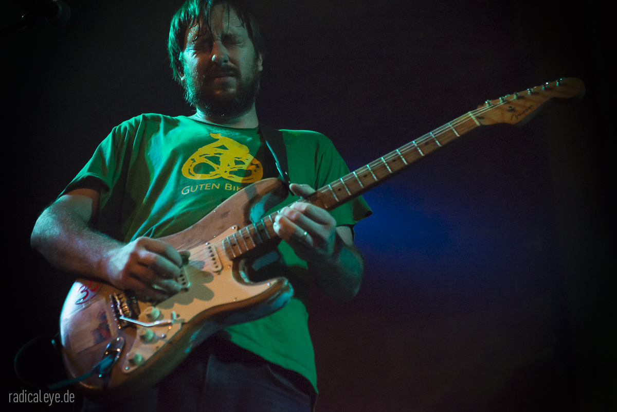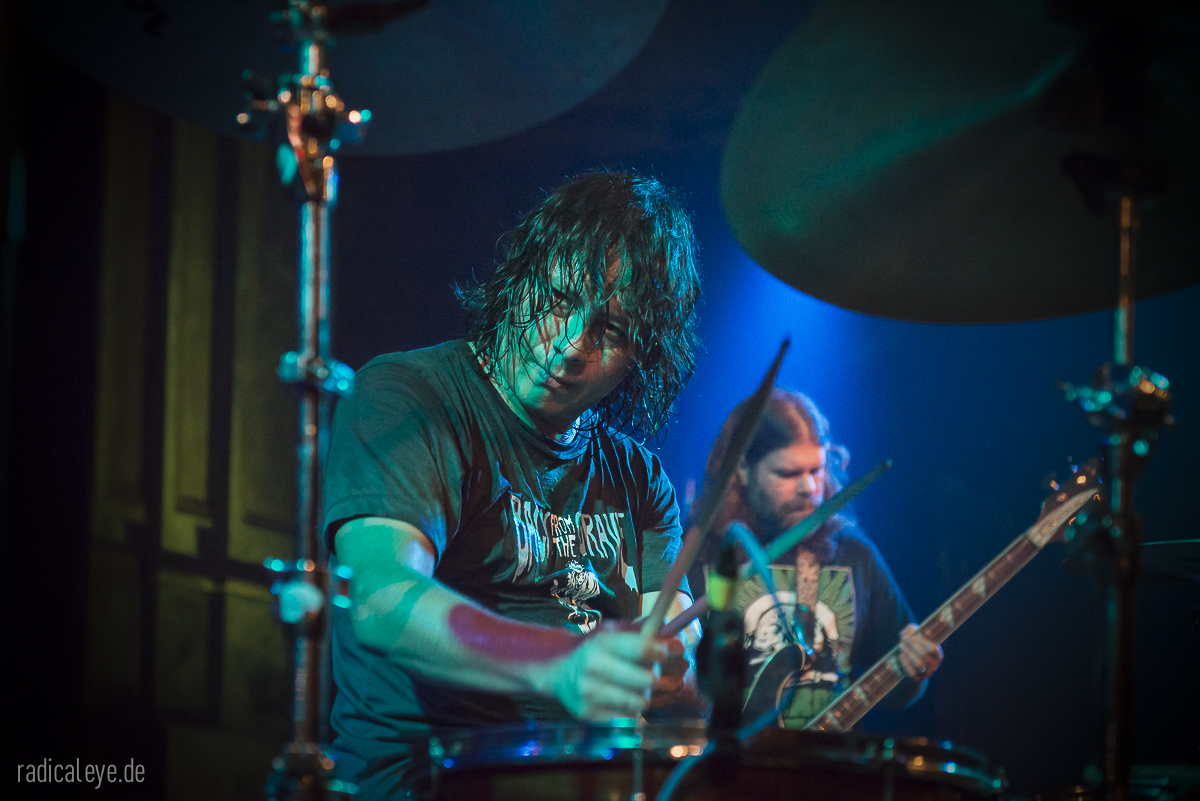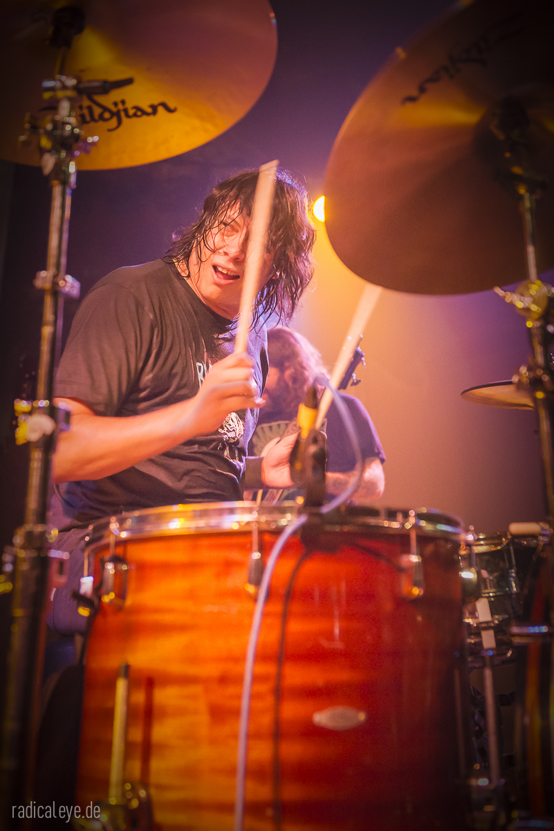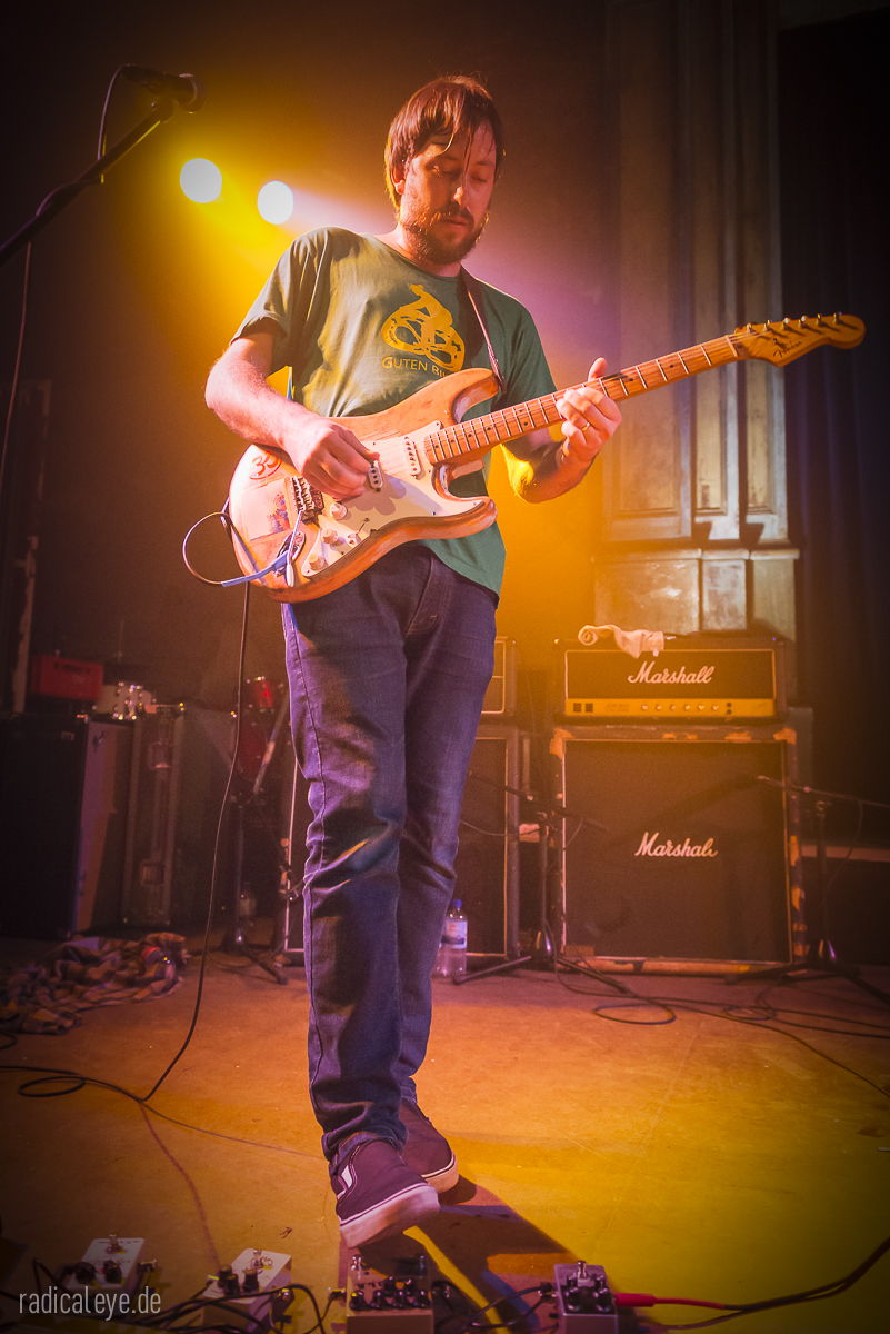 Nach einer kurzen Umbaupause, die mir Gelegenheit gibt, erneut den ungewöhnlichen Platz zu bewundern und von weiteren Fotoshootings zu träumen, entert die lebende Legende EARTHLESS die Bühne… Seit 2001 setzen diese drei Musiker Maßstäbe in Liveperformance und Jamkunst, sind aber bisher über den Geheimtippstatus nie hinaus gekommen. Der Gitarrist Isaiah Mitchell, Basser Mike Eginton und der ehemalige Profiskater Mario Rubacalba am Schlagzeug benennen Krautrock, Black Sabbath, The Who, Motörhead und Psychedelic Rock als ihre maßgeblichen Einflüsse, die sie zu einem irren Mix verschmelzen. Und so ufert bereits der erste Song – wenn man in diesem Zusammenhang überhaupt noch diesen Begriff verwenden kann – zu einer irren Jamsession aus. Rubacalba und Eginton bilden eine der mit Abstand besten Rock-Rhythmussektionen unserer Zeit auf deren Basis Mitchell sich am Bass austoben kann ohne dabei steril oder zu technisch zu klingen. Die Stücke fühlen sich eher wie musikalische Monolithen an, die aus den Gefühlen der Musiker heraus jedes Mal aufs Neue entstehen. So fällt es mir auch schwer, einzelne Passagen oder Stücke besonders hervorzuheben – EARTHLESS wirken als audiovisuelles Gesamtkunstwerk, auf das man sich einlassen muss. Das ehrwürdige UT Connewitz bot dafür einen mehr als würdigen Rahmen – die Fotos sprechen davon und können hoffentlich ansatzweise einen visuellen Eindruck dieser außergewöhnlichen Performance bieten….(Jens)