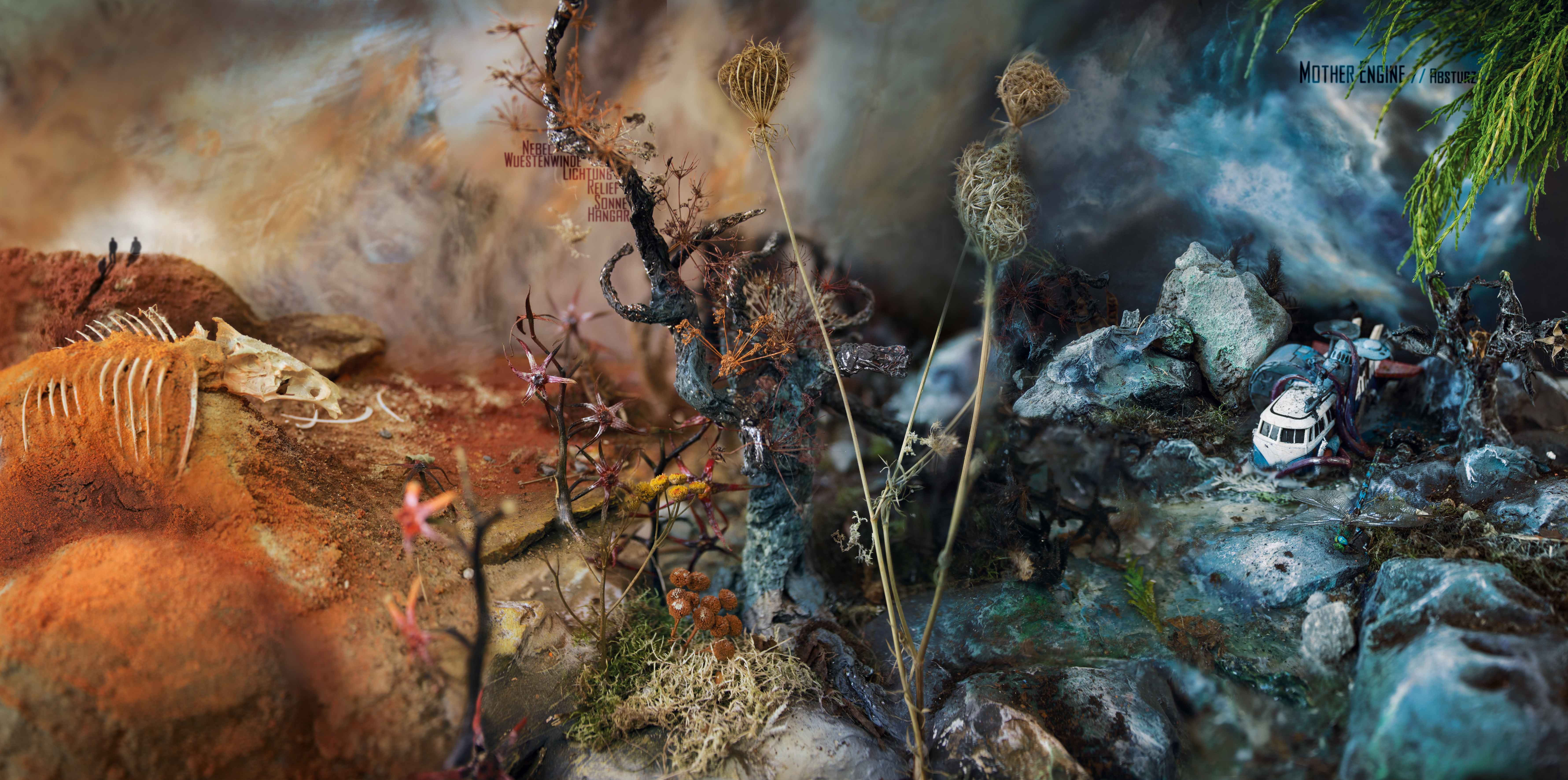 Warum kam es aber, trotz unüberhörbarer musikalischer Weiterentwicklungen, zum „Absturz“ der Mother Engine? Das bleibt auch nach exzessivem Konsum des Albums weiter der Phantasie des Hörers überlassen. Bevor ich mich aber auf die musikalische Reise begebe, werfe ich zunächst einen intensiven Blick auf das Artwork des Covers, für das einmal mehr die mit der Band befreundete Künstlerin Eusepia Lehe verantwortlich zeichnet und inzwischen als heimliches viertes Bandmitglied gilt. Das mit viel Liebe zum Detail entwickelte, gebaute und später fotografierte 3D-Modell des Absturzortes der Mother Engine erinnert mich ein wenig an die aufwändigen Installationen des amerikanischen Fotokünstlers Gregory Crewdson, der hier vielleicht ein wenig für Inspiration gesorgt hat. Eusepia’s Arbeit für das Cover wirkt um so beeindruckender, wenn man weiß, wie klein ihr Realisierungsbudget im Vergleich zu Crewdson’s Werken sicherlich war. Das muss man in Widescreen sehen! Da freue ich mich doch schon auf die Vinylversion mit Gatefold-Cover!