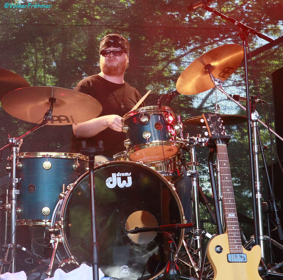 Finale erst noch ein großes Lob an das Publikum für seine Toleranz gegenüber der letzten Band. Denn das waren Klänge und Geräusche, die in Schöppingen bisher ziemlich sicher sehr sehr selten in die noch versammelten Gehörgänge fegten. Dragondeer aus Denver/Colorado begeisterten mich alten Stoner- und Psychedelic Rocker. Eine Band, die jedes Stonerfestival bereichern würde. Sie Coloradierten Staub und bunte Bilder auf und in Boden und Himmel, verfuzzt, verhallt und Halleluja. Eric mit Harp, Gitarre und Gesang, Cody mit Gitarre und mächtigen Slideattacken, Carl an den Drums und der sich fast das Genick ausknockende Bassist Casey garantierten in besonderer und phantastischer Weise für das Cross und Over und Cross-Over im Festivalgeschehen. Ihr Auftritt glich einem Höllenritt durch die Wüste, der Horizont prahlte mit vielen Farben, der Grooveteppich strahlte in allen Farben, die Berge glitzerten in der Ferne, die Landschaft Colorados in das Gras von Schöppingen gemeißelt.