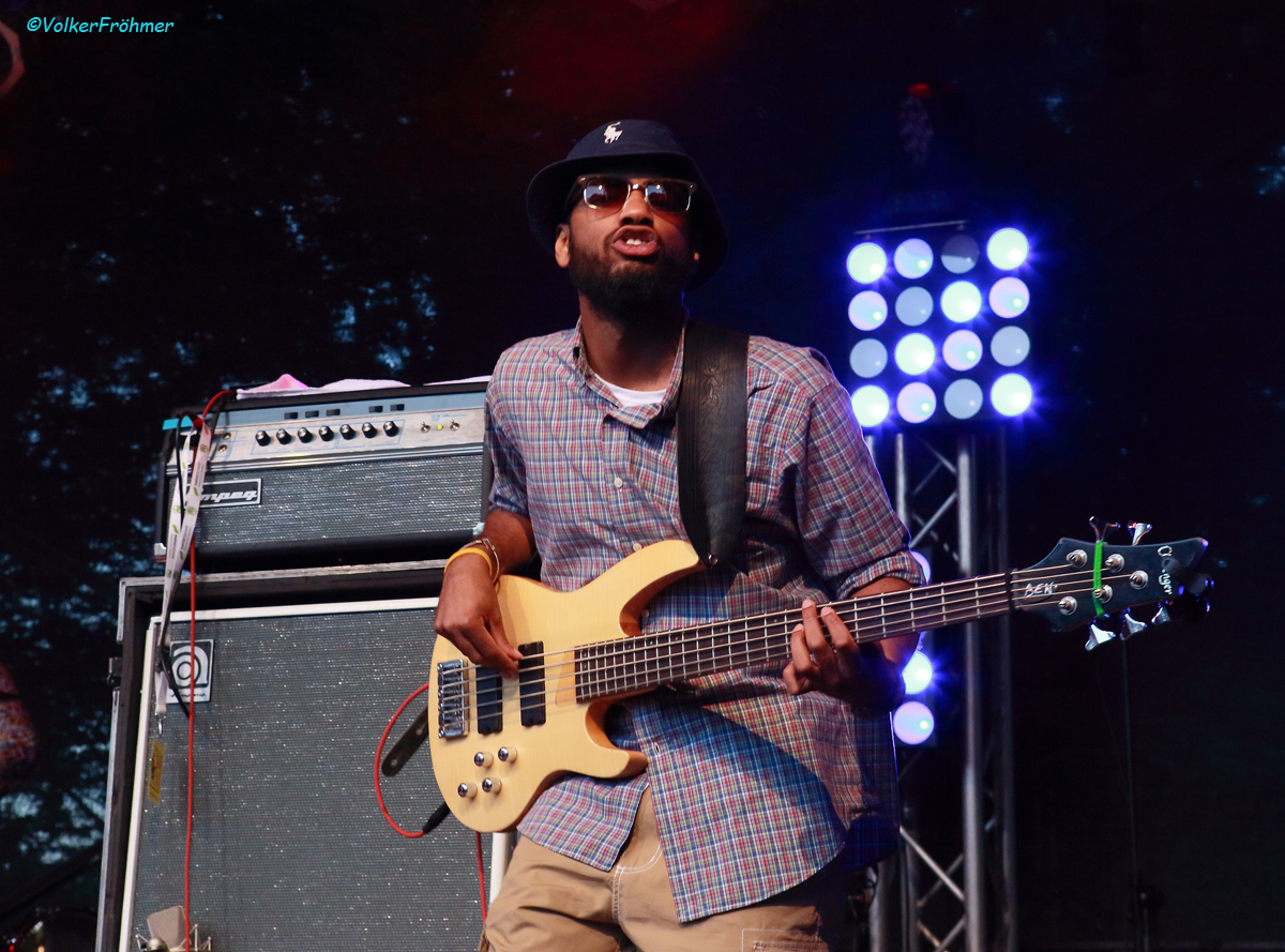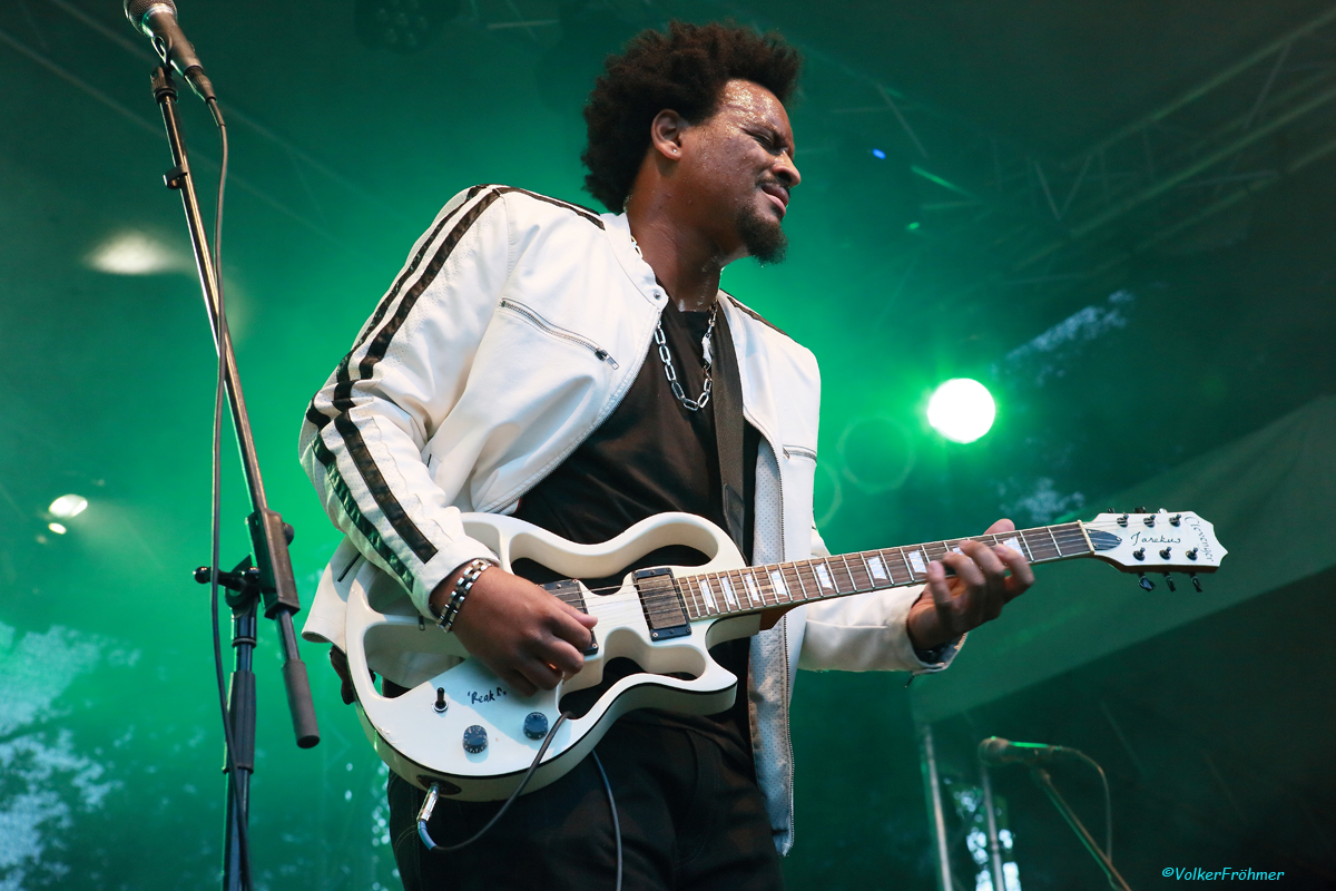 Als vorletzte Band stand der aus Mississippi stammende Jarekus Singleton mit seiner Band vor uns und zog alle Saitenregister, aber auch stimmlich malträtierte er seine Bänder bis kurz vorm Zeriss. Der Groove mit kräftig zuschlagenden Damenhänden und flitzefingrigen Basshänden unterstützte den Cross-Over Blues des Gitarrenmeisters aller Klassen in jeder Lage. Jarekus verschmelzt den Mississippi Blues mit Rap und Rock, rockt und rollt wie die Sau und hat den Blues. Schwitzt, schweißt, prügelt und soult seine Musik in die Herzen und Seelen des Hörvolks vor der Bühne, das begeistert mitgeht. Ein großartiger Entertainer, er ist eine Option für die Fortführung des Blues, eines modernen Blues mit alten und neuen Zutaten.