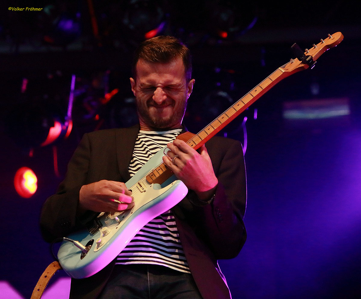 (vo) Nach Mister Hammond und seinen Jungs gibt es Bluesgetränkten Pubrock in bester und großartigster englischer Manier und Machart, The Dirty Aces sorgen für ausgelassene Partystimmung und Feuer unterm Dach. Und wer die niederländische Art, einem Konzert zu lauschen, liebt, kam auch auf seine Kosten, da ging im Volk und an den Bierzapfhähnen die Post ab. Die Asse verzieren ihren Sound neben dem Bluesgrundgerüst mit Classic Rock, fahren mitunter nicht mit uns Schlitten, sondern parken ihn zusammen mit leichtem Punk auch in einem Garagenrockgewand und rocken und rollen und mischen für knapp 50 Minuten das Auditorium auf. Die mir vorher nicht bekannte Band begeisterte mit ihrem Können und ihrer Energie. Die Band: Giles Robson, Sänger und phantastischer Stimmzungenverbieger – seine Harpeinlage „Train Inpersonation“ – ließ nicht nur meine Ohren schnalzen. Desweiteren waren da Tommy Hull am Bass, Filip Kozlowski an der Gitarre, dem man jeden Saitenton im Gesicht ablesen konnte (siehe Bild), und Schlagzeuger Simon Hall, der die Truppe auspeitschte und antrieb.