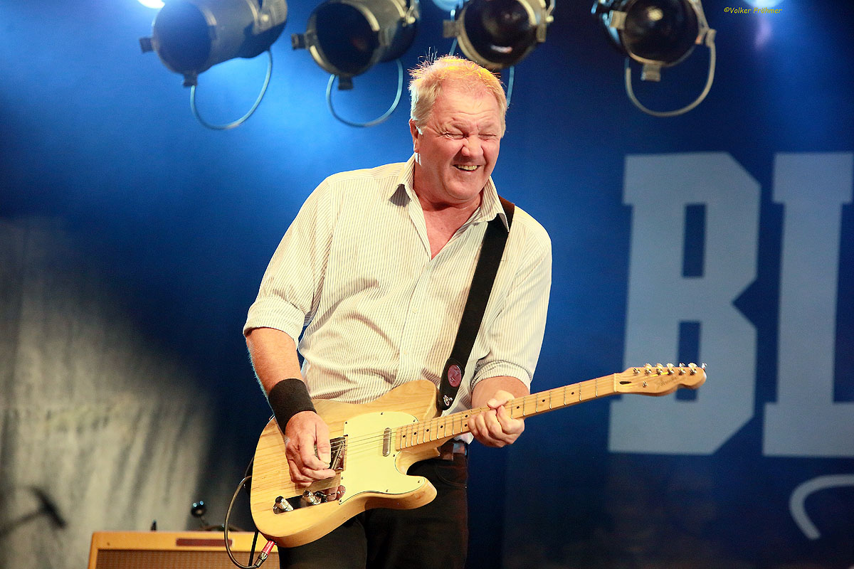 Um 18 Uhr 45, die Sonne strahlte nach einem heftigen Gewitterguß mit mir um die Wette, betrat eine meiner Leib- und Magenbands die Bühne, es begann eine knapp einstündige Therapie in der Praxis von Dr. Feelgood. Die Heiler, die meine Wehwehchen wegspielten: Robert Kane, Einpeitscher am Mikro und Harmonika. Kevin Morris, der u.a. „Milk & Alcohol“ in den Hoochie Coochie Man“ prügelte. Phil Mitchell, der dem Sound mit seinem Bass, britischem Understatement und einem Glas Rotwein als Treibstoff die Sporen gab und der unvergleichliche Steve Walwyn, der dermaßen mit vollstem Körpereinsatz (seinem und dem seiner Gitarren) Riffs und Licks in die Menge schruppte, blueste und rockte, das in meinem Gesicht so manche Freudenträne den Weg in meinen Bart findet Was für eine phantastische Behandlung, da wird der Arztbesuch zum Ereignis. „Back In The Night“, „Down By The Jetty“, „Who Do You Love“ sind einige Heilsbringer. Unter der Bühne tobt, tanzt und rockt das Volk, Volker natürlich auch, und zum Abschluß gibt es eine Version von „Bony Moronie“, die mir mit einem einminütigen „Tequila“ endgültig den Rest gibt, Leber, Nieren und Herz und Soul arbeiteten während des Auftritts in gesundheitsfördernster Weise.