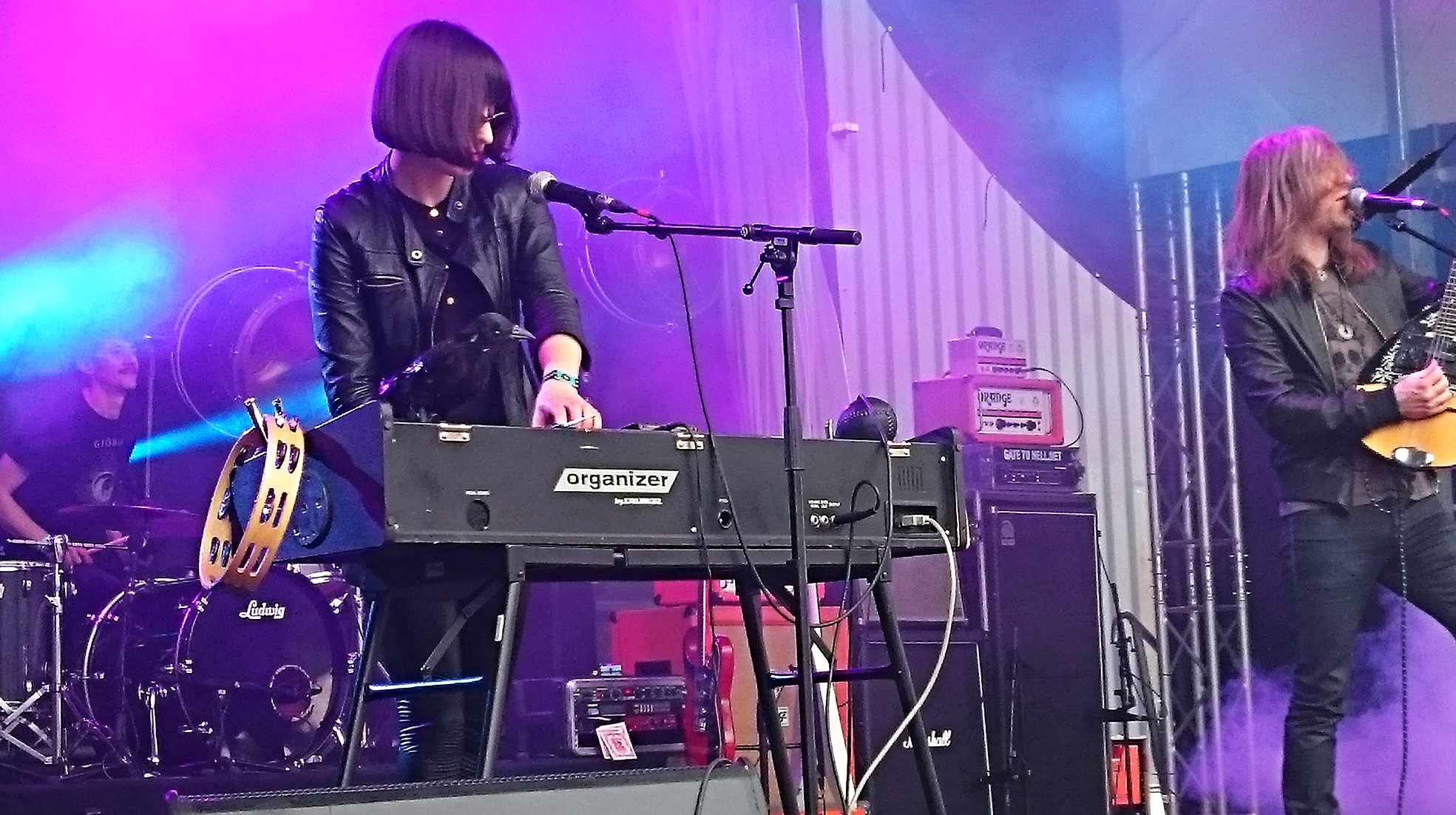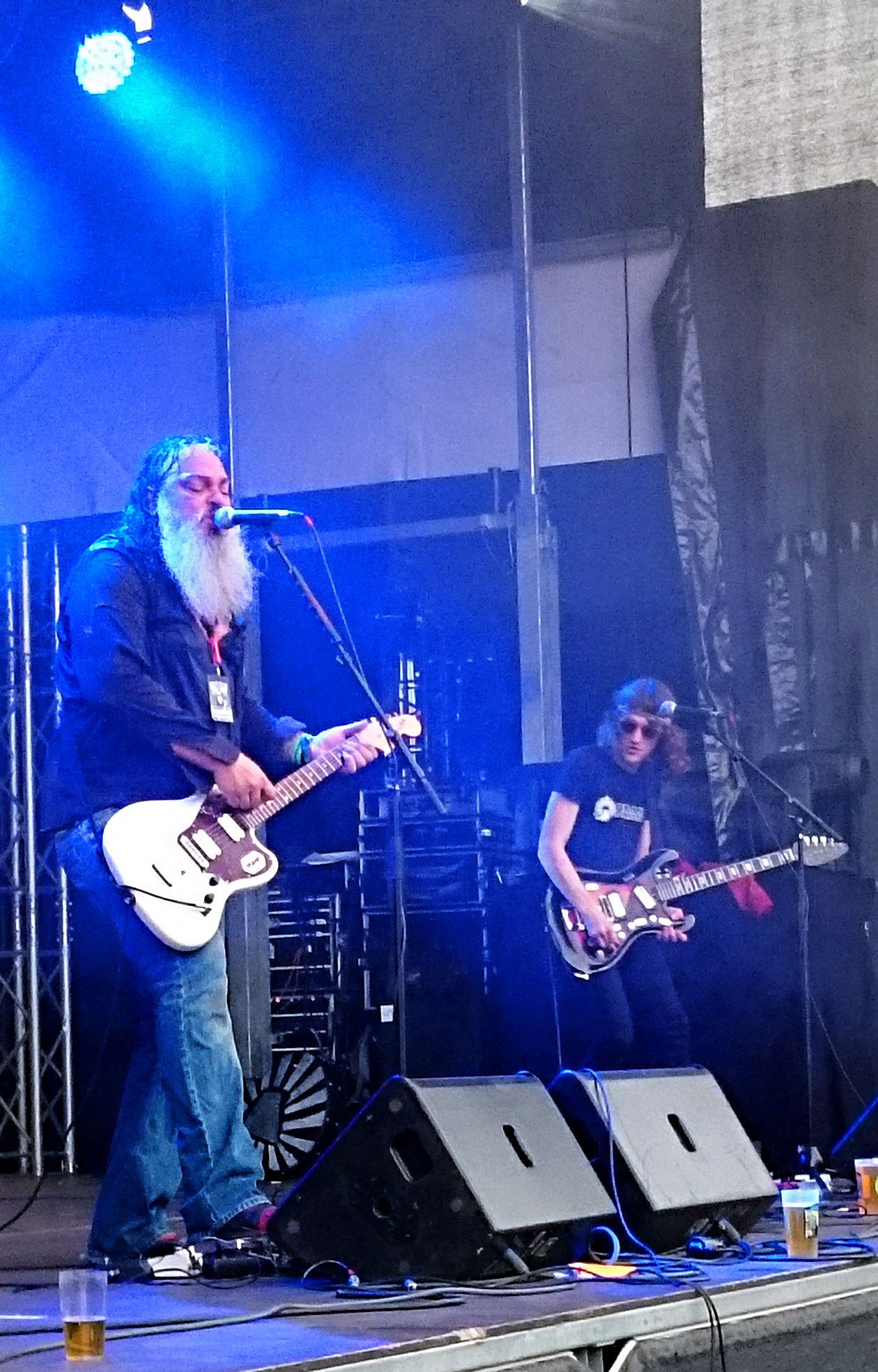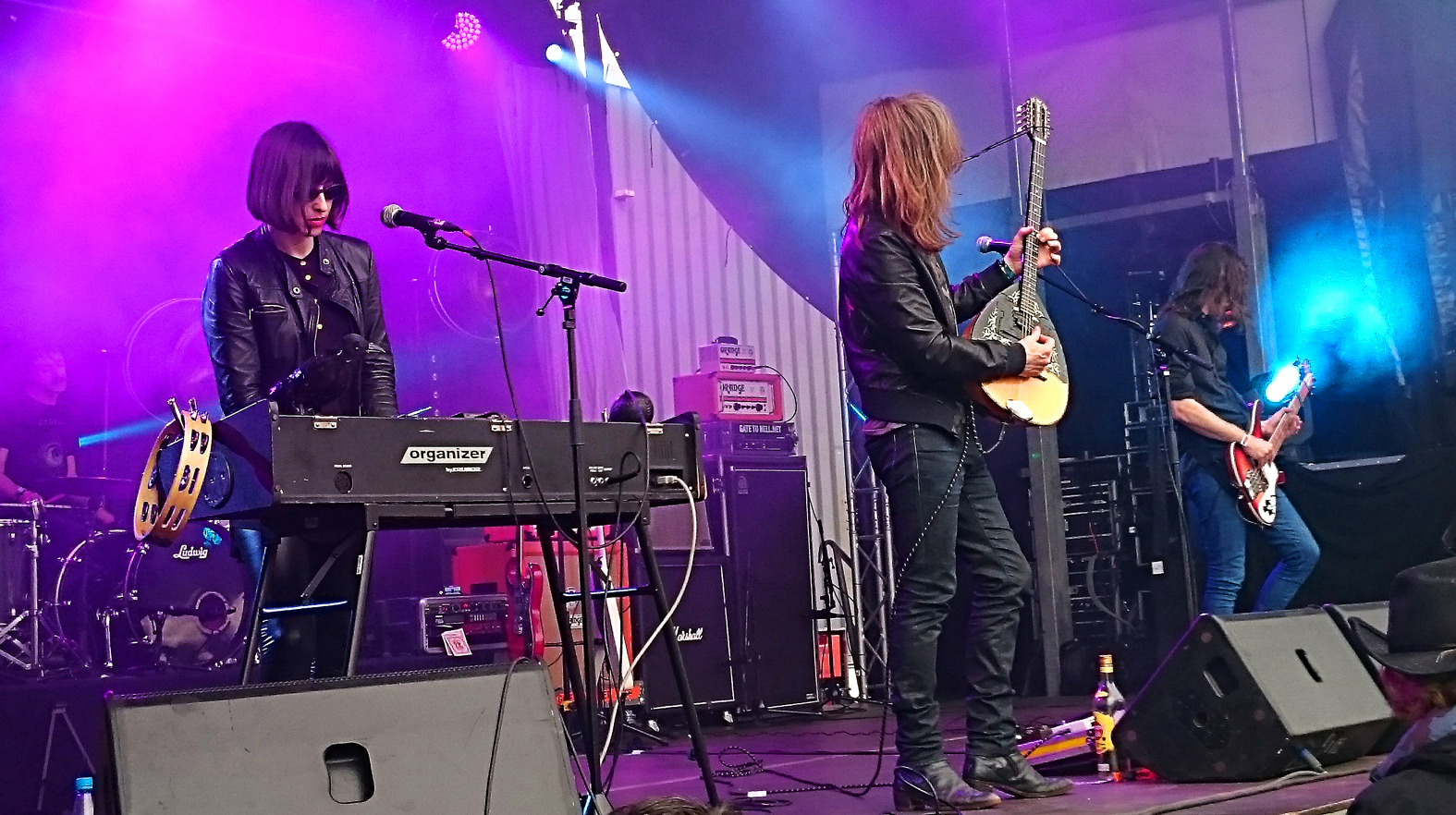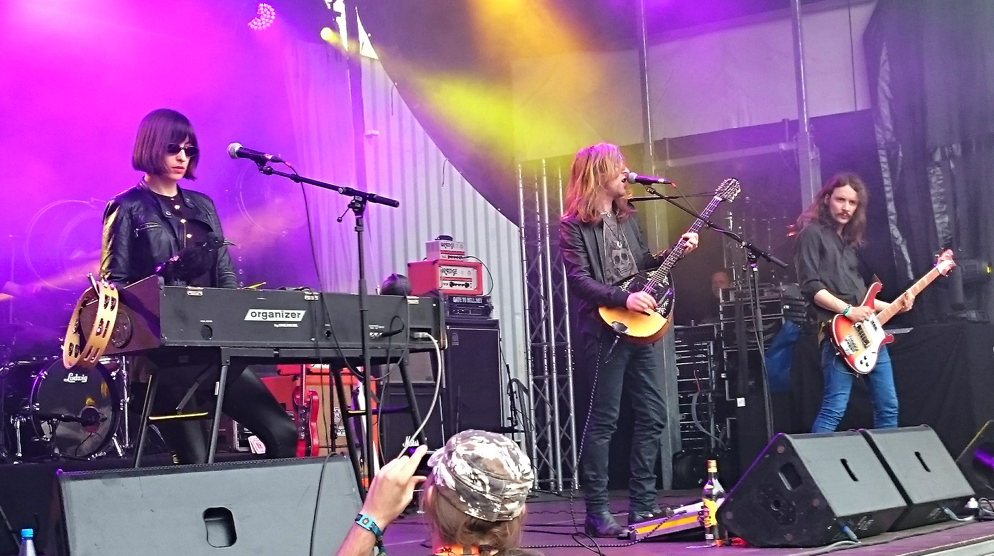 (ch) Am Donnerstag, dem ersten Tag des Festivals, schmetterte Volker bei schönstem Wetter gegen 18.30 Uhr seine freundliche Bandansage in die Zuhörermenge. Es ist fast schon Dämmerung aber eigentlich immer noch zu hell für die New Yorker „White Hills“, denen pure Dunkelheit mit grellen Lichtsequenzen einfach besser stehen. Wie eine vollendete Soundmischung brauchen sie eben auch die schönen Lichteffekte.