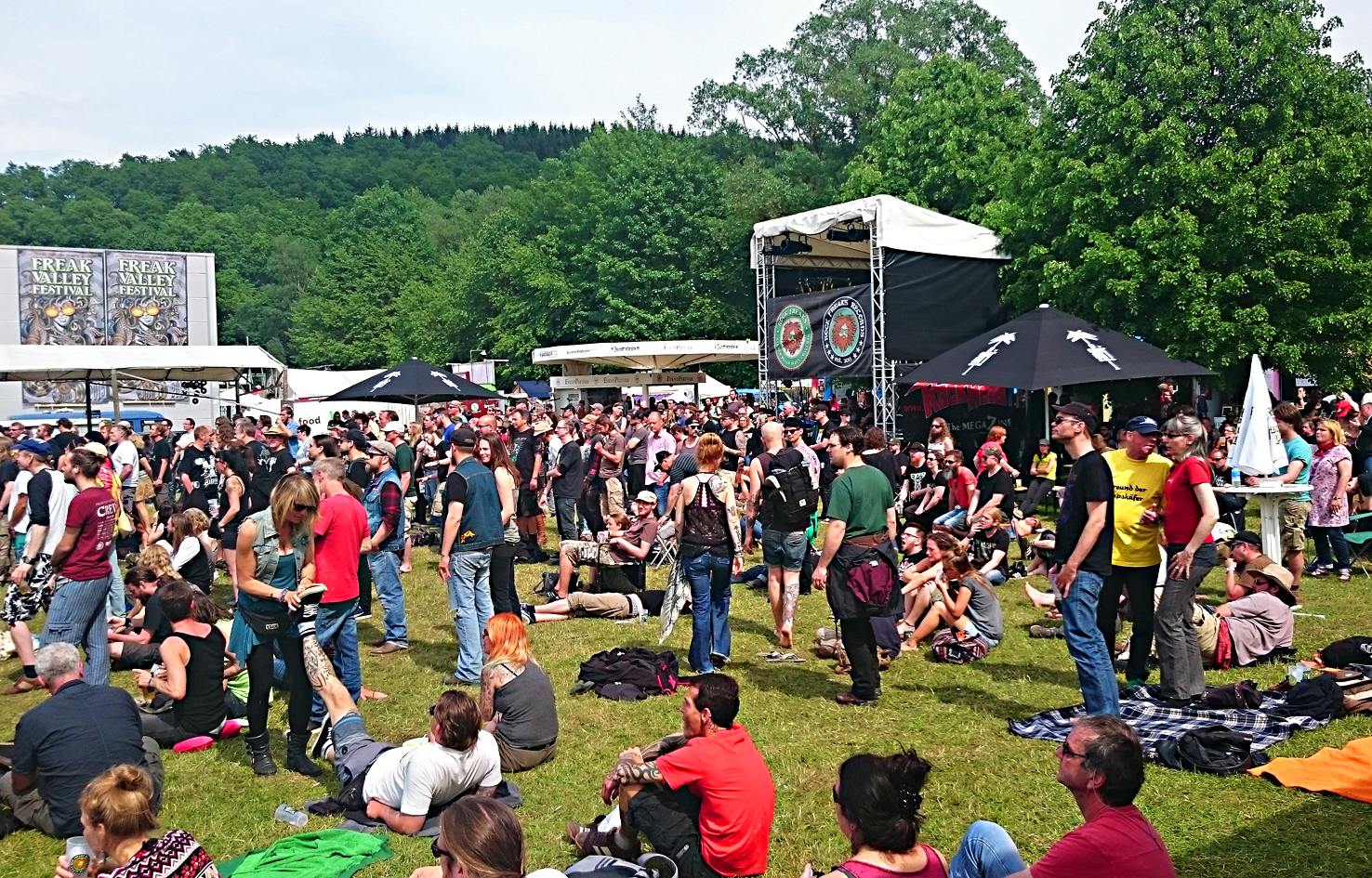 Überblick: Der gesamte locker flockig rockende Freak Valley Partyplace zur besten Schönwetterzeit. Der Timetable-Aushang für den akustischen Durchblick, wenn man selbst mal die herzliche Ansagen von Volker nicht mitbekommen hatte. Sowie eine kleine Ruhepause oder Auszeit und die Ankündigung bzw. die Ruhe vor dem Sturm, der zum Glück nur in feucht fröhliches Bindfadengetröpfle mündete.