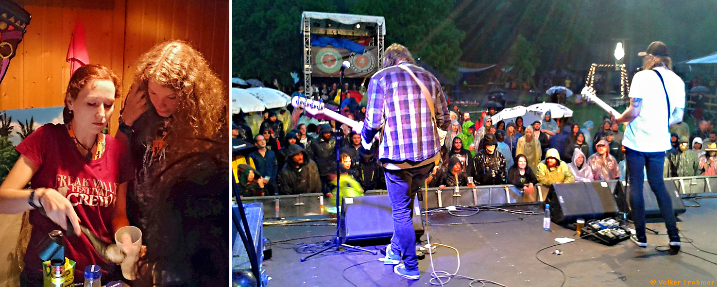 Daraufhin konnte ich dem verwässerten Treiben auf der Bühne, vom weit entfernten Fensterbereich der Freak Valley Holzhüttenmixzone, einfach nicht mehr länger tatenlos zuschauen. In mir reifte der dringlichste Auftrag heran: „Der abduschenden Wolke mal gepflegt am tropfnassen Hinterteil zu lecken!“ – Regen? … was für‘n Regen?
