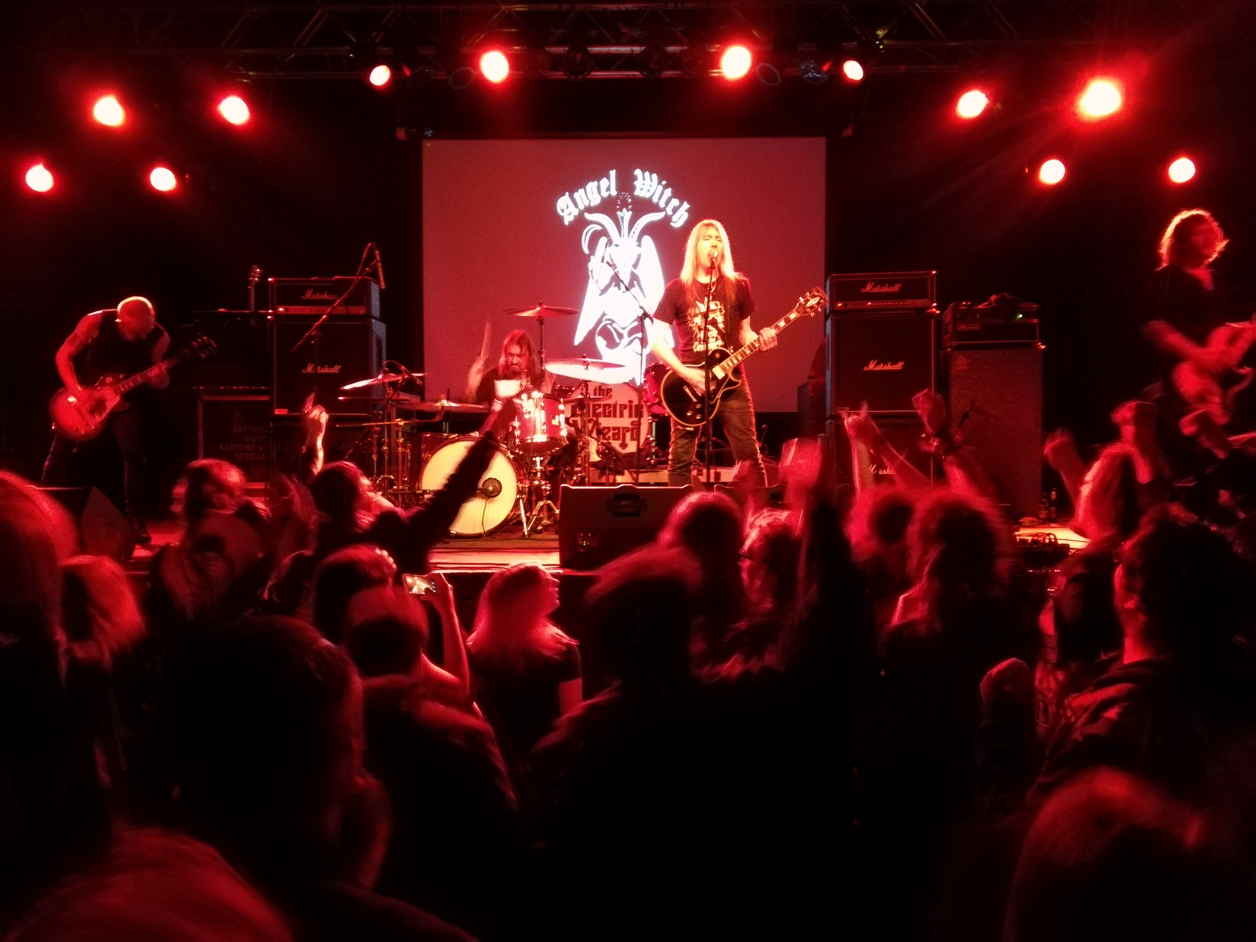 (KiS+ol) Angel Witch stehen heute Abend auf dem Plan als Vorband. Interessant! Da hat jemand diese alten Londoner ausgegraben, die sich schon 1977 als „Lucifer“ formiert haben. Eine natürlich extrem bewegte Bandgeschichte, vielleicht lag da doch irgendwann Baphomet´s Fluch darüber, ließ am Ende Mr. Heybourne als Gründungsmitglied übrig. 2012 erschien das letztes Album As Above, So Below.