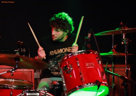 Killer Boogie, was für ein Bandname. Aber der ist Programm! Und wie: Die drei Italiener LUIGI COSTANZO – DRUMS, GABRIELE FIORI – GUITARS, VOCALS und MATTEO MARINI – BASS hauen uns, für eine Stunde, Boogie und Bluesrock der heftig deftigen Art unter die Füße, boooooogie all night long! Genauso wie auf ihrem Album „Detroit“, das ich besitze, brettern die drei mit uns sofort und ohne Gnade ab auf den Boogie Highway mit dem Eröffnungs Speedboogie „Bad Rebel“. Links und rechts, neben und hinter mir fliegen Frauen- und Männerhaare um die Wette, bei mir, zwischen einigen photografischen Auslösungen, die Barthaare. Sie (die Band, nicht meine Barthaare) preschen mit uns durch ihre schon benannte LP und auch zwei ihrer drei Songs der Split LP zusammen mit The Golden Grass, Wild Eyes und Banquet kommen aus den Boxen. Etwas gesitteter wird die „Summertime“ beschworen, nicht verkehrt angesichts der Temperatur draussen vor dem Badehaus. Hier drinnen wird sehr gut geheizt, Danke Jungs!