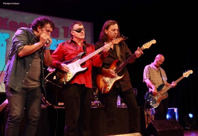 Und dann natürlich d i e s e Band: die Groove for Move Masters Drew Allain – Bass und Kevin Schermerhorn – Schlagzeug, die Mike auch in den USA unterstützen. Und die beiden, zumeist mit der Fender Strat, Alleskönner an den Saiten, Mike Morgan und Jim Suhler, die zusammen schon unzählige Gitarrenschlachten schlugen, zusammen oder auch getrennt mit ihren jeweiligen Bands, Mike mit seinen Crawl und Jim mit Monkey Beat und als Lead-Destroyer in der Band von George Thorogood.