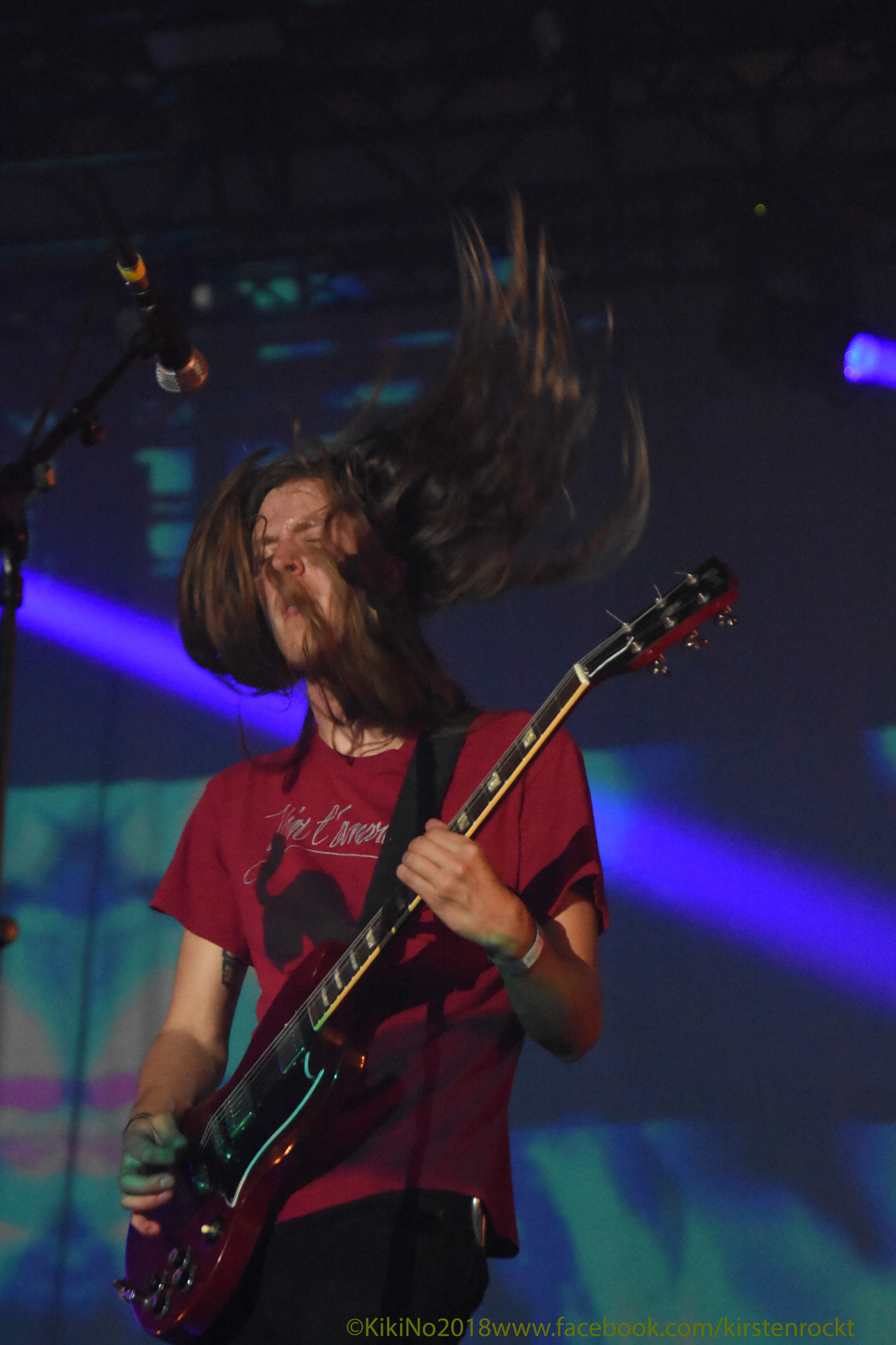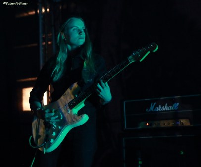 Im März 2018 erschien ihre neue Platte „Madness is too pure“ und aus dieser bretterten sie schon auf Vinyl großartig klingende Songs in den jetzt mittlerweile schon bei schwül angelangten Frühsommerabend, fast das komplette Album in dramaturgisch für Liveauftritte besser geeigneter Reihenfolge als auf Platte sang Johanna die großartigen Songs, unterstützt von Schellenbaumklängen und Tanzeinlagen, Sofia richtete an den sechs Saiten sehr gewichtige Worte ans Volk vor der Bühne, mal mächtig abledernd, mal kreischend fuzzig, mal „gib uns die Kante und noch mehr“ (bei Gold Mind), „Deadlock“ mit seinem leicht orientalischen Riffen, und Groove? Ja, aber hallo: Johanna an den Drums und Linn am Bass sorgten für steten Nachschub und Schub….