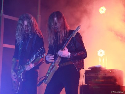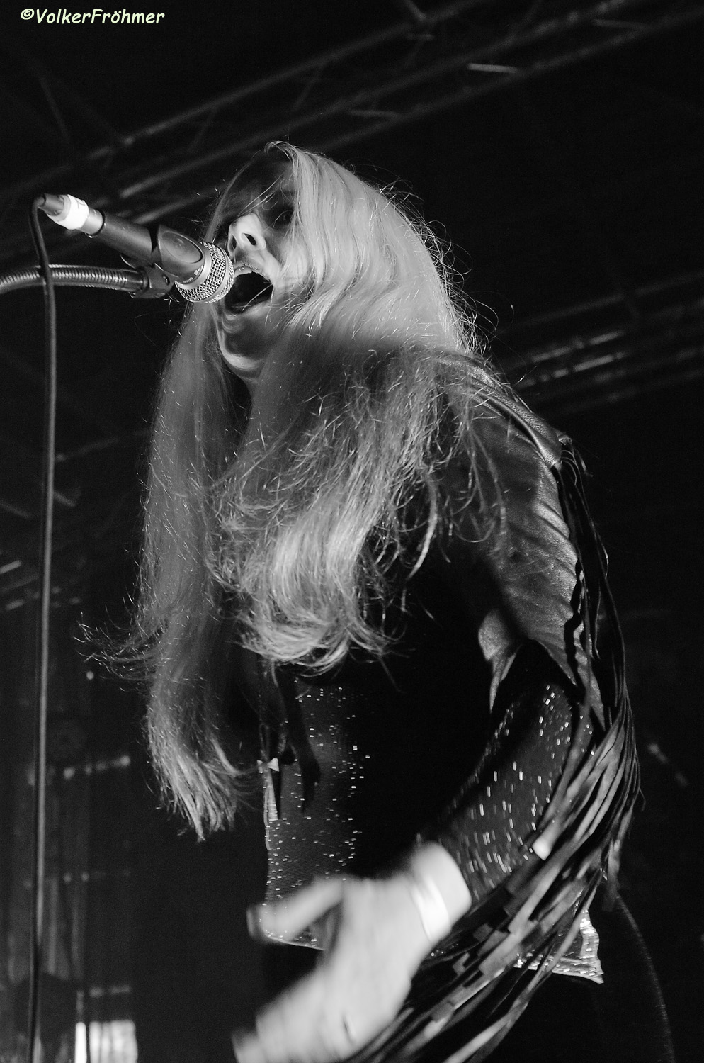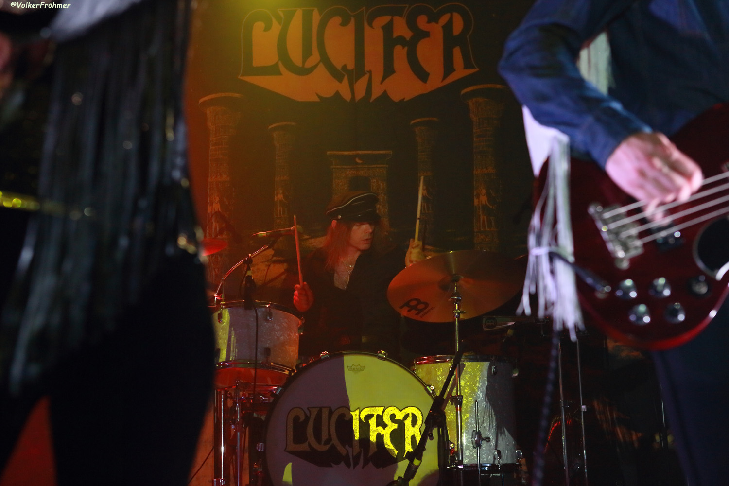 Lucifer. Erstmal durchzählen: fünf Langhaarige an Fellen (Nicke Andersson, auch in einer Handvoll anderen Bands tätig) und Saiten, dabei als Premiere eine drei Gitarren Fraktion. Und eine Langhaarige am Mikro, Johanna Sadonis. Sie alle nennen ihr interessantes Musikkonglomerat Magic Heavy Rock, passt für mich, aber leicht metallisch würd ich noch hinzufügen.