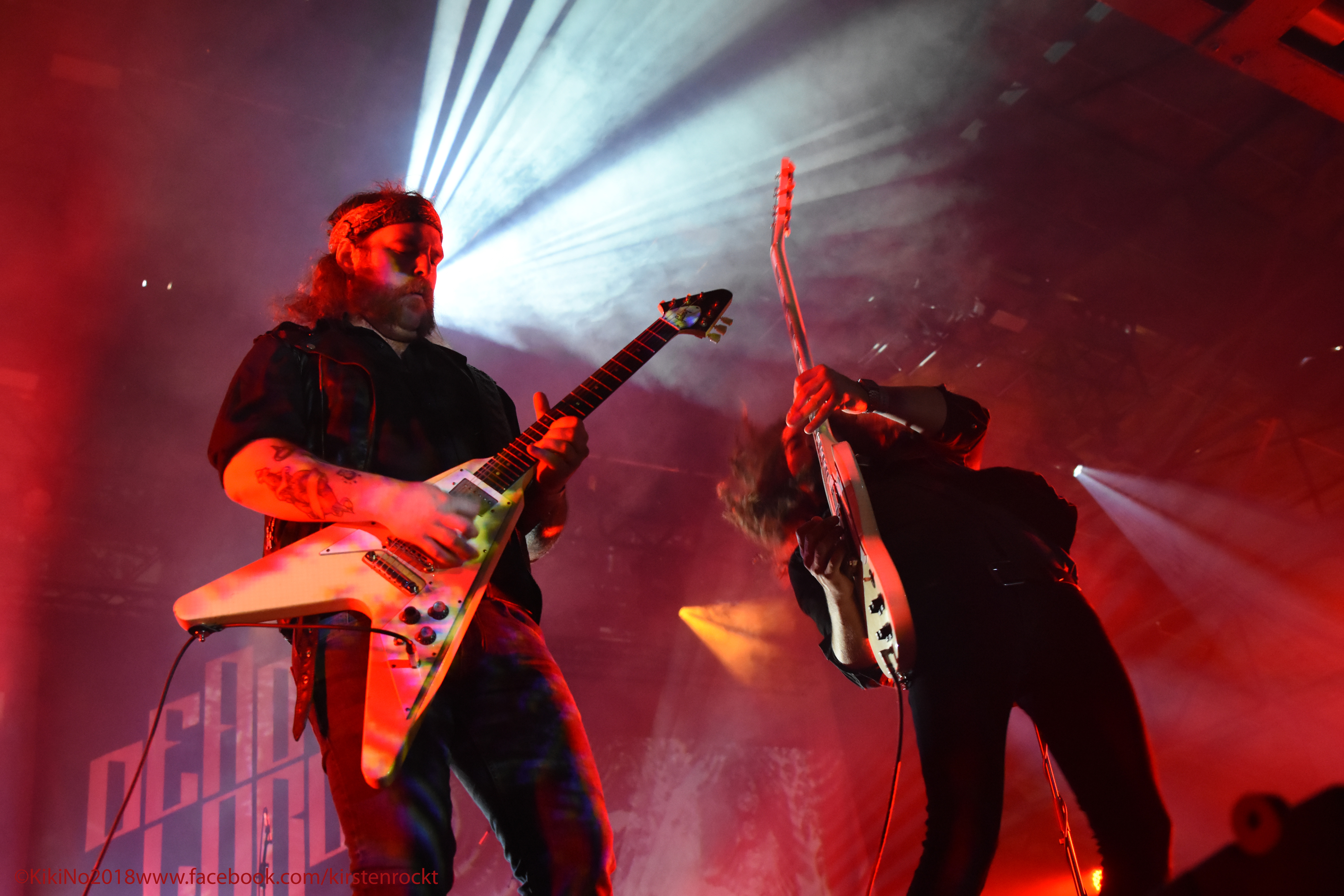 Dead Lord 16:20 -17:00 ooh, nur 40 Minuten Spielzeit, mit einem Tränchen im Knopfloch gilt es schnell zu genießen, was die Toten Lords auf der Mainstage darbieten. Gute Laune natürlich! Lord Nr. 2 bei diesem Festival, ebenfalls aus Schweden, liefern klassischen Hard Rock. Sagen die einen. Die anderen Ziehen jede Menge Vergleiche zu Bands aus den 70ern. Hakim Krim, charismatischer Sänger und Schnauzbart-Vorreiter der Szene, Olle Hedenström an der Gitarre, Backenbartträger und genialer Gesichtsgymnast setzten sich wie gewohnt energetisch in Szene. Martin Nordin am Bass bekommt wieder Kilometergeld während seiner Wanderung über die Main Stage, leider wie so oft, Adam Lindmark gaaanz hinten, hinterm fetten Schlagzeug im Nebel verschwunden. – In Ignorance We Trust -, na bitte, Motto erfüllt, zwinker.