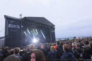 Während die nächsten beiden Bands spielen, begebe ich mich zu einem der Fischbrötchen-Stände im romantischen Birkenwäldchen gelegen. Mjam lecker, danach eine Waffel mit Blaubeermarmelade. Ach, da es heute kaum regnet, muss man sich auch eine Pause gönnen, den Damen und Herren beim Trockenfisch-Hämmern zuschauen, oder beim reichlich bestückten Bukta-Merch-Stand vorbeischnuppern.
