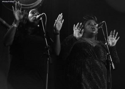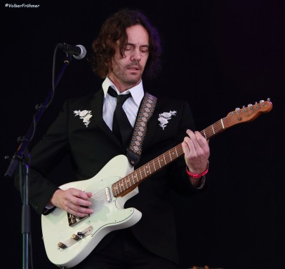 „Laurence Jones & Band„: Im Mittelpunkt von Sänger und Gitarrist Mr. Jones und seiner sehr toughen Band stand das letzte Album „The Truth“ (zur Rezi) und wie zu hören und sehen war: großartige Stimmung im Volk vor der Bühne, wo sich immer mehr Enthusiasten versammelten, auch die Sitzreihen und die dazwischen liegenden Stehgebiete waren mittlerweile sehr gut besucht. Und: sie war die einzige Band, die heute die eine Zugabe gab, aber die wurde aber auch ergröhlt und erklatscht und bejubelt: „Fortunate Son“ in einer guten Coverversion des CCR Klassikers. Auch zwischendurch gabs zwei Cover: „Before Accuse Me“ von Bo D. und „All Along The Watchtower“ von Bob D. Wunderbar fand ich neben dem Hauptgesang und den instrumentarischen Leistungen den prächtigen Backgroundgesang der beiden sehr stimmigen Ladys. Alles in allem eine gute Vorstellung der Band und Laurence wird seinen Weg machen, wie schon etliche damalige britische Bluesgitarren Jungspunde, die heutzutage sehr etabliert sind….Nicht wundern über „nur“ schwarzweiße Aufnahmen, aber das „normale, anwesende“ Bühnenlicht war schrecklich lila.