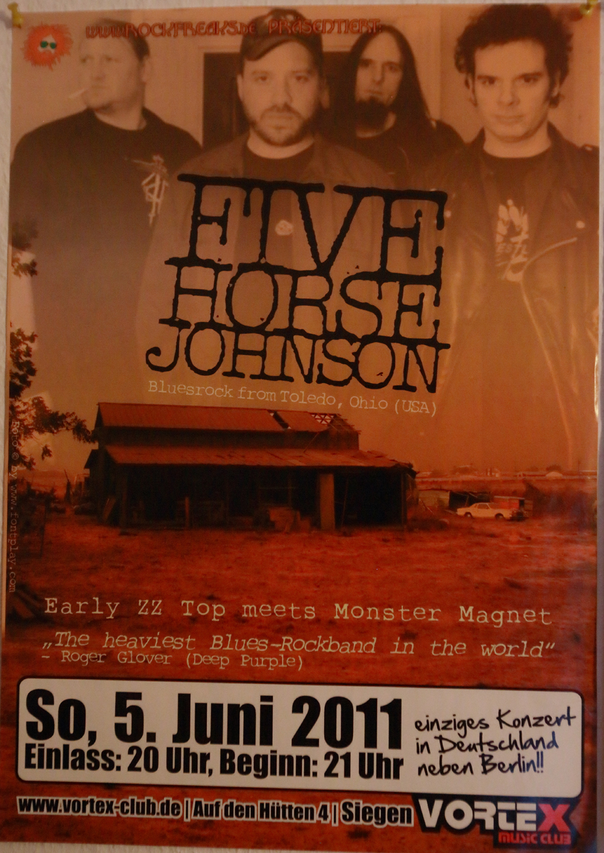 Ich machte auch noch mobil und es kamen genug Leute (sogar Kumpel Wolfgang mit Frau Sandra aus Heidenheim, ca 500 km entfernt, war dabei) das alles passte und wir erlebten einen großartigen Abend. Vorher, am frühen Nachmittag, war ich schon vor Ort, mit etlichen CDs von Five Horse Johnson, Luder und Giant Brain zum signieren im Gepäck. Im Biergarten des Vortex sprach ich Phil auf englisch an, er sah natürlich auch die Giant Brain und Luder CD und sprach zu mir, auf deutsch, „Du hast CDs meiner früheren Bands? Klasse“. Ich war verblüfft da ich dachte er wäre auch Ami, wie die anderen vier Bandmember. Und sein Nachname wurde ja meist Durr ausgeschrieben.