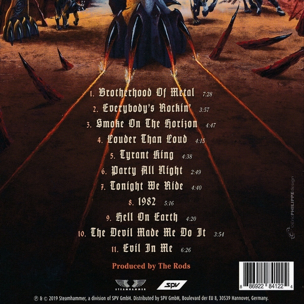 “Brotherhood of Metal” als Titel-Lied wird eingeleitet mit einem klassischen Piano-Intro. Das Drei-Gestirn lud als Gast den Keyboarder Lonnie Park ein. David setzt danach mit seinem epischen Canto und Gitarren-Solo ein. Carl eröffnet mit Trommel-Donnerhall, gefolgt von Gary, eine moderne True Metal Hymn Passage zu Ehre des Herrschers der Unterwelt. “Everybody’s Rockin’” ist eine Granate für Headbanger und David manifestiert welch virtuoser Gitarrero er ist. Sie waren auch in der Laune für guten alten Hard-Rock mit “Smoke On The Horizon”, mit Lonnie an den Keys im Jon Lord Stil. Bei “Louder Than Loud” schreit sich Mr. Feinstein alles Böse aus dem Leib. “Tyrant King” ist für Liebhaber von “Pain Killer”. “Party All Night” ist ein metallischer Jamboree-Song, mit funky Grooves durch die exzellente Rhythmus-Sektion und Gitarren-Shredding. Entscheidet selbst, ob dies für Euch ein Party-Hammer oder unnötiger Langeweiler ist… “The Devil Made Me Do It” ist definitiv die Kulmination von „BOM“, durch elektrisierendes Songwriting, Gesang und Axe-Bass-Drums Eskapaden im Schlußteil. “Evil In Me” ist der Abschlußtitel und eine Verneigung an DIO. Mann, was wäre das für ein intergalaktisches Monster-Stück mit diesem als Sanges-Gott geworden.