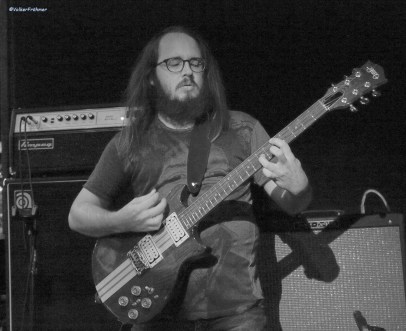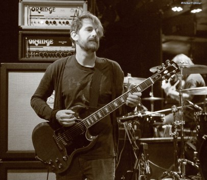 Kurn nach 22 Uhr ertönten die ersten Klänge des Grazer Dreigestirns in Sachen abwechslungsreichem Stoner Rock mit vielen Rockfacetten: großartiger Gesang von Basser Benny, Dreschflegel Felix auf dem Hocker ohne Lehne und dem großartigen Sechssaiter Jakob, ein Powertrio, das Falten in den Wüstenanzug oder in die Kutte schmirgelt. Dunkelschwarze Doombretter vibrieren im Gleichklang mit schwersten Heavy Riffs, die treffen auf ein fast melancholisches Zwischenspiel, verfuzzt noch mal. Felix treibt und treibt, kann aber natürlich auch ganz leise den Sound füllen und Benny berserkert und filigranisiert mit den vier Saiten. Seine Stimme: nicht dunkel sondern meist hell, mit kurzen Ausnahmen, und fast immer auf 180 und Jakob kann sooo vieles an dem Sechssaiter…..