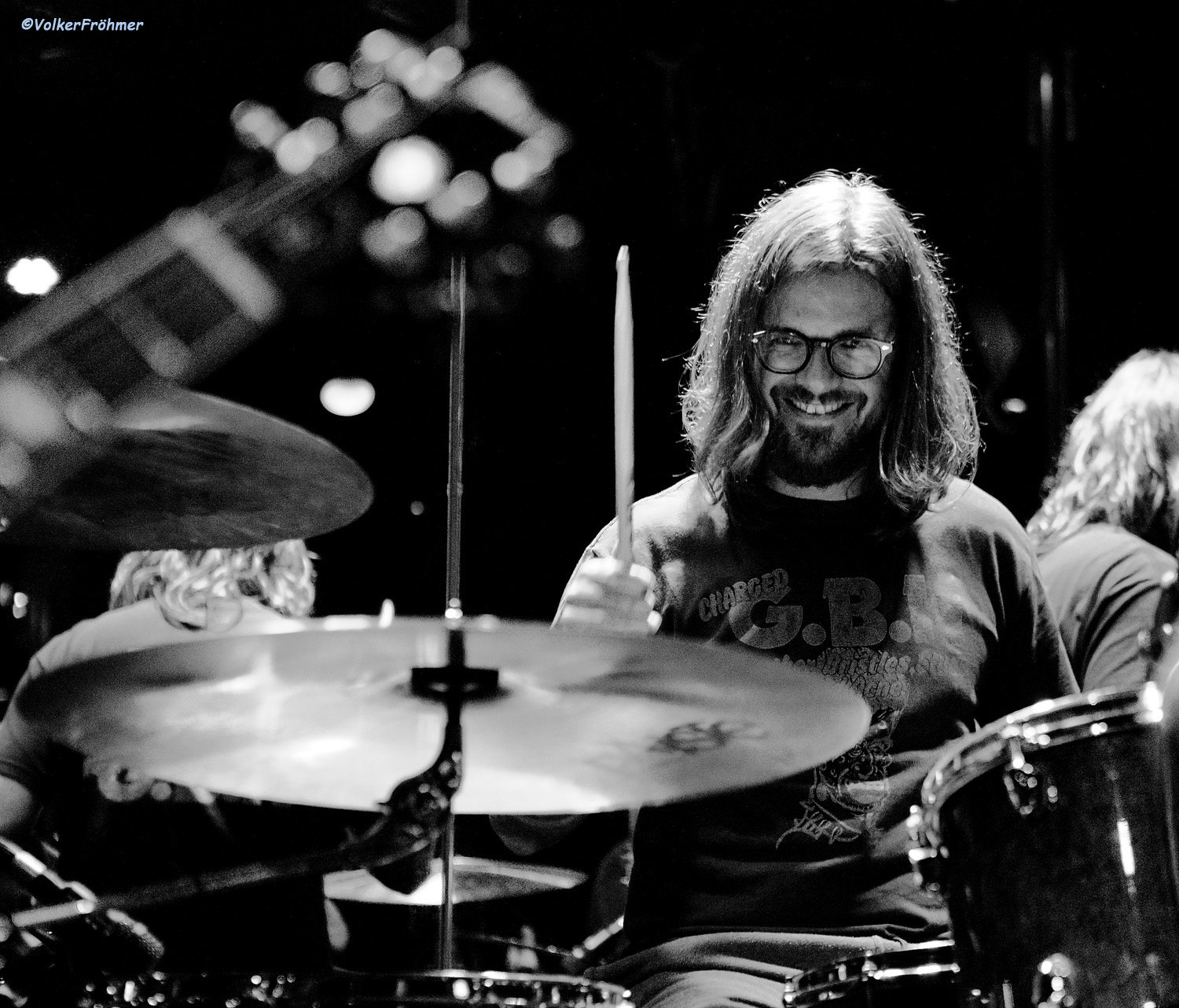 Und natürlich wie erwartet erwartete uns drückende, druckvolle, harte, stark groovende und mitunter deftig losbratende Kost, ihre Musik ist nix für´s Mitklatschen sondern für harte Nackenmassierschübe und, wenn noch auf dem Schädel möglich, massive Kopfbehaarungsbewegungen. Ist aber trotz der Härte auch was zum Hineinversinken. Der MG Sound mäandert durch Stoner, Post und ein bißchen Doom, erinnert sogar in Sequenzen an Toolsche Leistungen, brät und brettert unentwegt wie die Sau, da wackeln die Wände und der Spiegel hinter Schlagwerker Bernhard vibriert. Er ist für mich sowieso einer der während seiner vergnüglichen Arbeit freundlichst dreinschauenden Spieler unserer Szene. Zusammen mit Clemens am Bass sorgt er für den stark drückenden Groove, während Daniel und Lukas die Melodeien in die Kompositionen ziselieren, schreddern oder schraddeln oder schruppen, mit kurzen Soli aufmuntern.