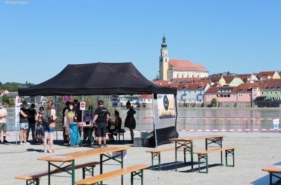 Am Einlaß bekamst du einen festen Sitzplatz zugewiesen (bei mir Einzelsitz A 15 ganz vorne an der Bühne da mit Photopass) sodaß es auf dem Gelände zu keinerlei unnötigen Abstandsunregelmäßigkeiten kam: das war großartige Vorarbeit der Organisatoren, deren Arbeit ich, genauso wie Bühne, Sound, Essen und Trinken bemerkenswert gut fand, auch der zeitliche Ablauf war perfekt. Großes Lob an alle! Und wie ihr seht war die gegenüberliegende Kulisse (Schärding am Inn/Austria) was für´s Auge.