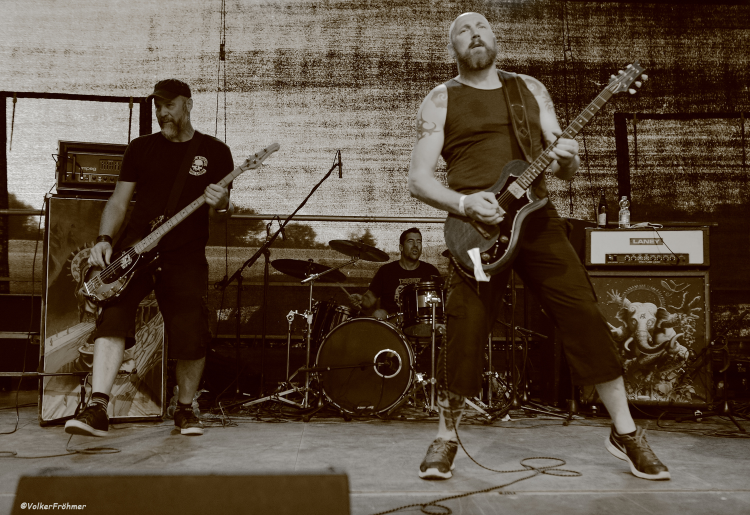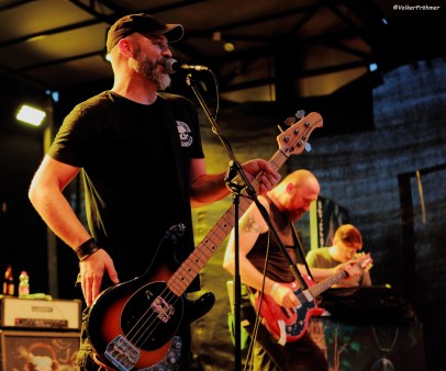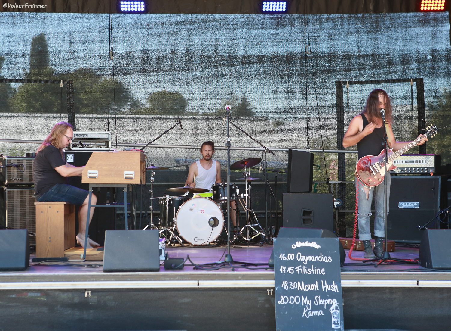 16:00 Uhr Ortszeit, 33 Grad im Schatten, das Open Yair wird eröffnet: diese Ehre hatten die drei Power Doomer und Grunger und Metal Rocker „Ozymandias“ aus Linz an der Donau. Besetzung: Christoph Wagenhofer – VOC/GIT, Armin Lehner- ORGAN und Florian Loimayr – DRUMS. Und wie ich sie zum ersten Mal beim Lake On Fire 2019 erlebte erlebte ich sie auch hier: da gibbet in die Fresse und Magengrube, mit Stimmbänderexplosionen, hartem Gitarrengroove und Tasten, die das Ganze auch drücken, nicht nur nach vorne sondern den Sound auch großartig füllend. Sie gehören auch zur mittlerweile sehr stark angewachsenen Szene qualitativ hochwertiger Bands unseres Nachbarlandes. Das Gesamtpaket Ozymandias gab alles, Christoph schrie sich oft genug die Seele aus dem Leib, wie er dabei noch die Saiten traf blieb mir damals wie heute ein Rätsel, Florian drosch die Explosionen mit nach vorne und Armin? Armin gab den ruhenden Pol in der Band und fütterte innen und außen den Sound fett. Feiner Auftakt.