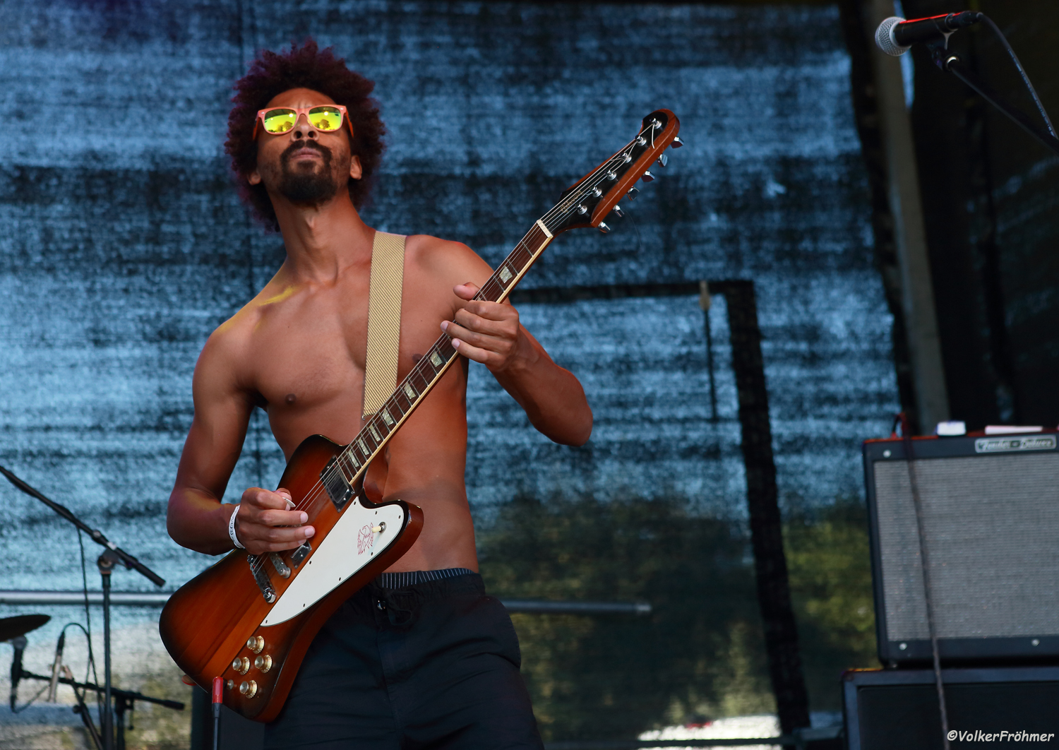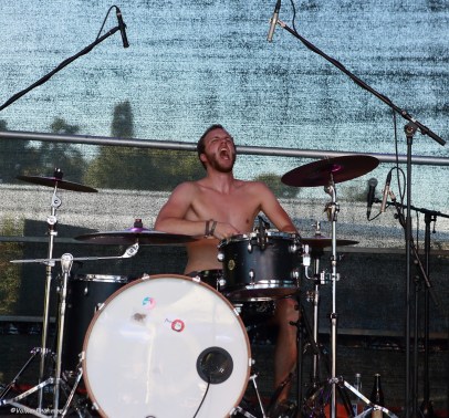 Um Punkt 17:15 Uhr startete der Oberpfälzer Blues- und Funkexpress „Filistine“ durch und brachte sogar einige Mädels zum Tanzen…..die sichtlich Spaß am Sound des Neumarkter Bewegungstrios hatten, denn die drei schonten sich nicht, sie powerten los wie nix und waren nach einigen Minuten genauso klätschnass geschwitzt wie die Tänzerinnen. Auch wir übrigen Zuschauer hatten Spaß am Tun der drei und ich versuchte den in die Augen laufenden Schweiß beim photographieren zu ignorieren, denn jetzt brütete nicht nur die Musik richtig auf. Die Musiker: Samuel Meier – Vocals & Bass, Om Hari Lasar – Vocals & Guitar, Jonas Böhm – Drums. Die Stimmen- und Stimmungswechsel brachten die Jungs zusammen mit ihren powernden Aktionen auf der Bühne beim Publikum sehr zügig auf die Gewinnerstraße, auch einige Gimmicks wie u.a. das Hinterkopfgitarrensolo von Om Hari sorgten für Stimmung auf dem Innlände. Ich höre mir Bands, die ich im vorhinein nicht kenne, nie vorher an, denn ich laß mich gerne überraschen: in diesem Fall ´ne schöne Überraschung, im besten Sinne des Wortes.