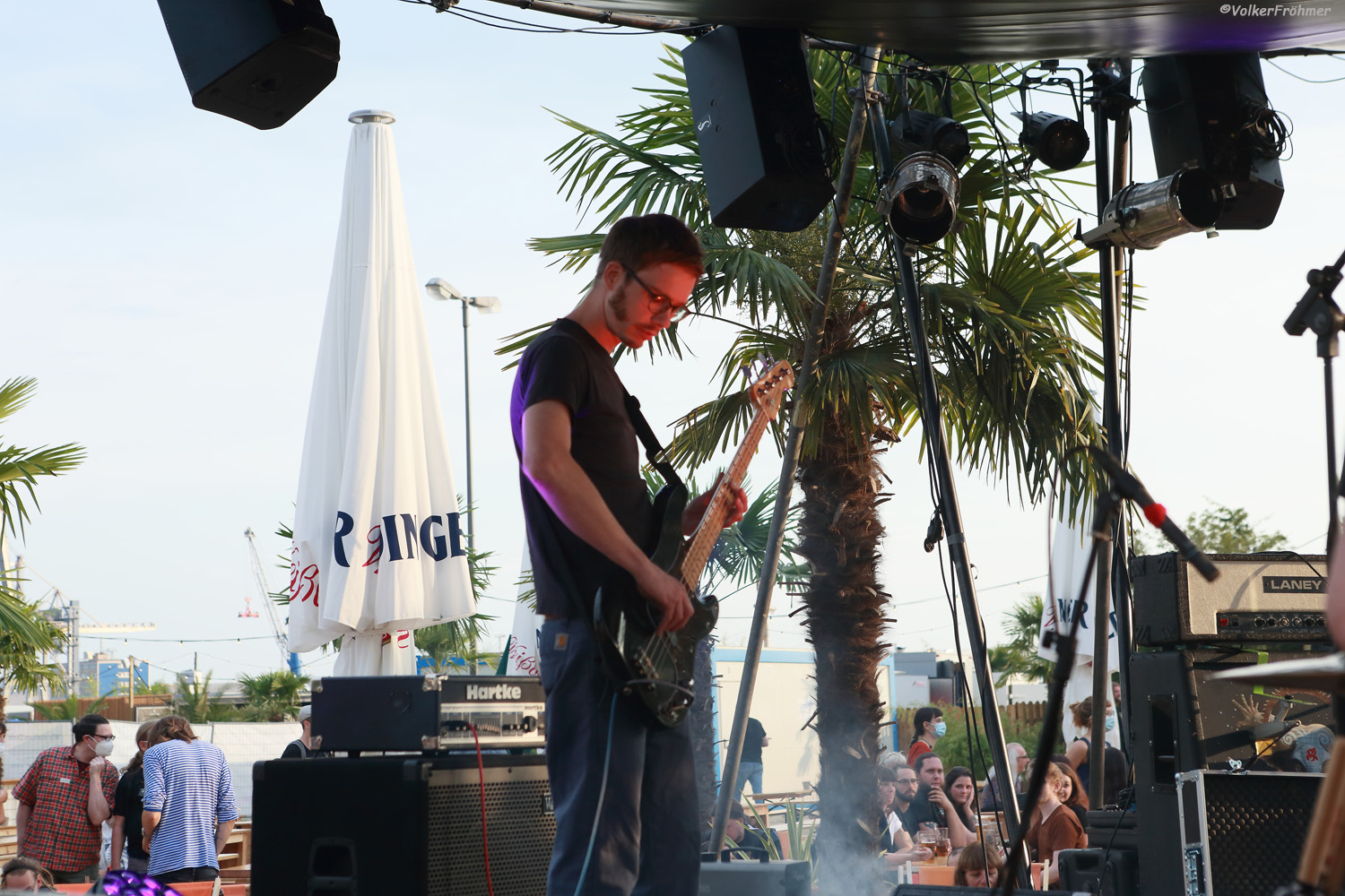 Die Band gibt es seit 2018 und bisher zu Gehör konservistisch ausschließlich auf ihrer Bandcampseite (Link siehe weiter unten), aber nach dem gehörten und dem Applaus für ihre Darbietung wäre es Zeit auch für haptisches Material. Zur Besetzung gehören Jonas, Kai, Moritz und Simon und das Quartett bringt ihre instrumentalen Kompositionen mit Bass, zwei Gitarren, Schlagzeug und gelegentlichen Synthitasten unters Volk und wenn ich mich nicht verhört habe spielten ihre fünf auf Bandcamp zu hörenden Musikalien auf, auch hörbar mit viel Applaus aufgenommen und verarbeitet. Und ihr Song „Baumhaus“ passt ja auch vortrefflich zum Geschehen. Zwischen den verschiedenen Gerüchen aus Getränken, Gras, Weserwasser und schön angewärmter Luft zelebrierten sie ihre Musik in verschiedenen Aggregatzuständen: Melancholie, auf die Fresse und die Nacken, sperrig und laufen lassen, Rhythmik, mal vertrackt, mal fließend. Nicht nur mir hat’s gefallen, herzlichen Dank dafür!