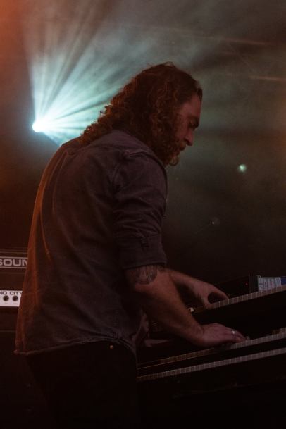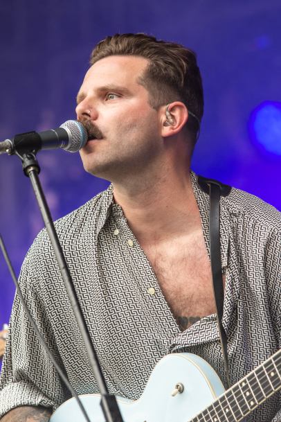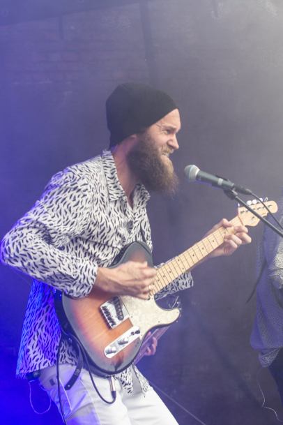 Aber fast pünktlich zum Dienstbeginn der ersten Musik Kombo des Abends, den Lokalmatadoren Lobby Boy, schaltete der Himmel auf Regencapes zusammenfalten und Schirme zu, die ersten Klänge lockten zum Frohlocken vor die Bühne. Lobby Boy sind eine neue Dortmunder Band, die sich aus verschiedenen Bands zusammenfand, auch musikalisch. Ihre Musik würde ich als kernigen Indie-Rock bezeichnen, der vom schon zahlreich vor der Bühne herumzappelnden Hörvolk gut aufgenommen wurde. Hier und da traten kleine technische Probleme auf, hervorgerufen durch das viele Nass das auch die Bühne nicht verschonte: dadurch ließen sich aber die Feiermeute und die vier Musiker nicht verdrießen, endlich wieder Musik: nicht von Youtube und anderen Anbietern, sondern live, farbig, laut und Gelenke entschlackend. Da ich bis dato nichts von ihrer Musik kannte – für mich unbekannte Bands hör ich mir vorher nie an um positiv überrascht zu werden – erfreute mich das Gehörte um heute festzustellen das das von ihrer EP „Parade“ stammte.
