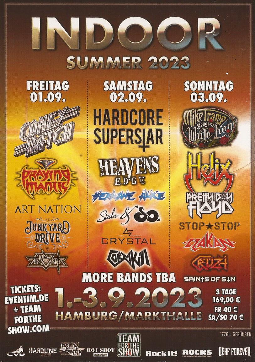 (mh) Sonntag, der 04 September 2022 war der finale Tag an dem den Headbangern beim Indoor Summer 2022 nochmals eine grandiose Mischung von Melodic-Rock bis zu Glam/Sleaze-Metal präsentiert wurde. Die Markthalle Hamburg war erneut die Lokation für die metallische Pilgerreise! Es waren erneut Fans aus allen Kontinenten omnipräsent um gemeinsam bei exzellenter, friedlicher Stimmung an der großen Bar über Ihre Lieblingsbands zu chatten, sich mit Festival- und Bands-Merchandise einzudecken, neue Freundschaften zu schließen oder Ihre Stars bei den „Signing Sessions“ zu treffen.
