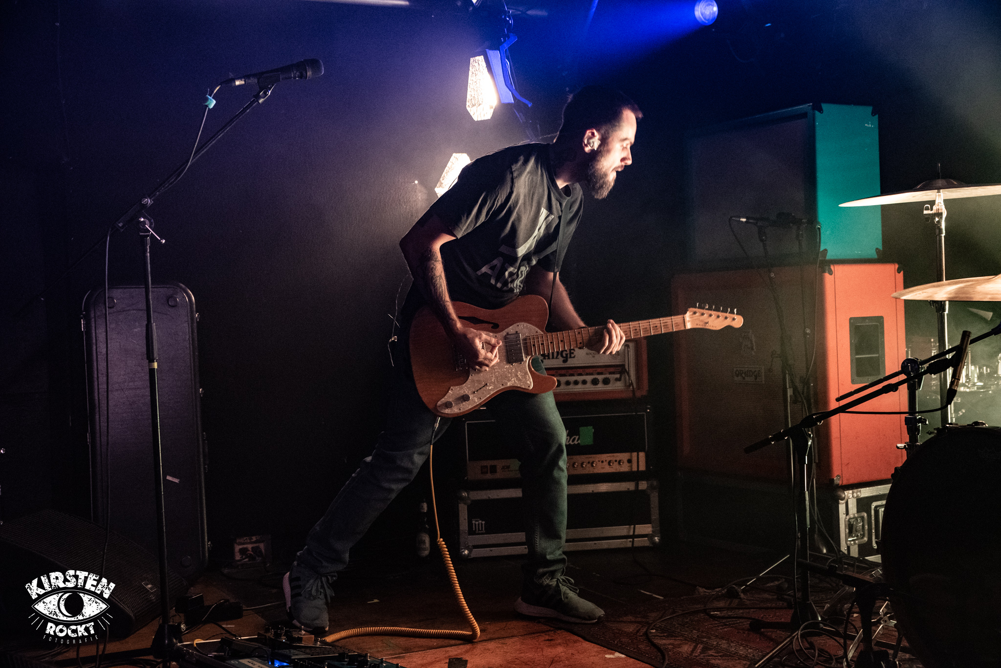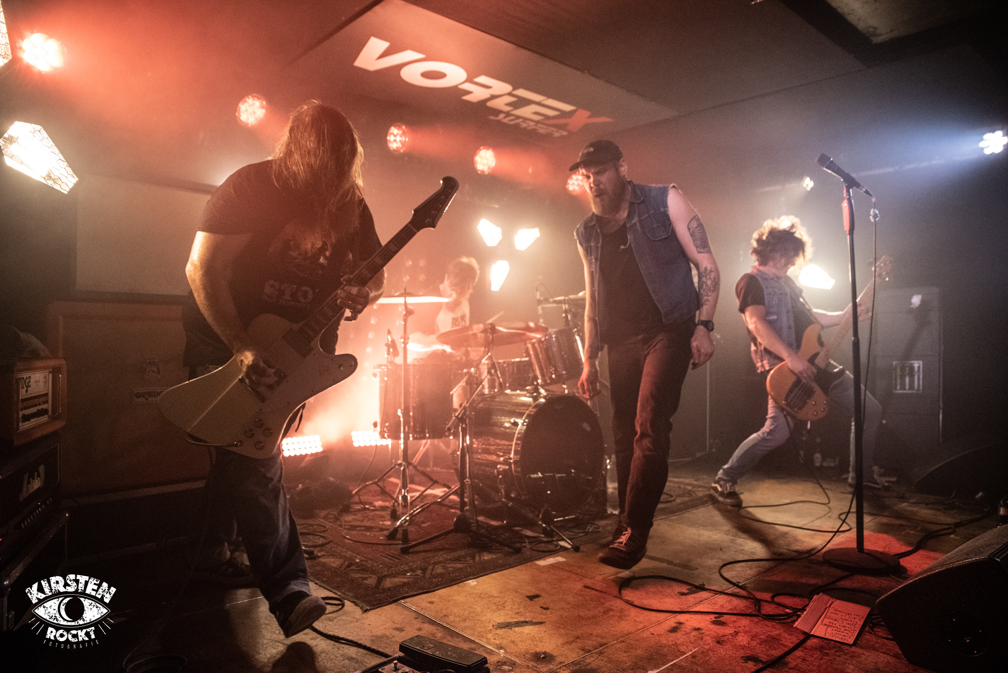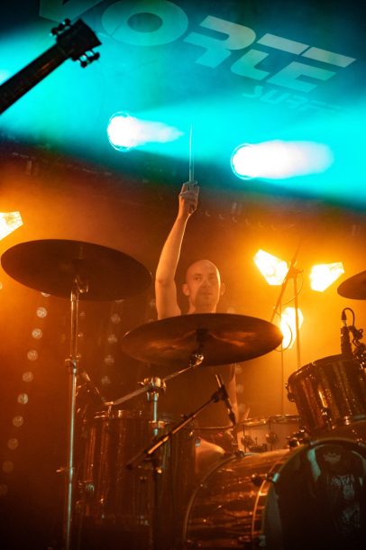 Langsam wird es enger und wärmer im Konzertraum. „Sightwaster“ vom 2016er Album „The Sun“ erscheint nun in deutlich schnellerem Tempo, leichte Aggressivität löst die vorangegangene Schwere ab. Beinahe schon verzweifelt brüllt Ihor seine wenigen Worte in dem ansonsten instrumentalen Stück in die Welt hinaus, die Menge gröhlt entsprechend mit im abschließenden Applaus. Eine authentische und vielversprechende Band, die getrost und gerne mit mehr Selbstvertrauen die Bühnen betreten darf. Als ich im Anschluss an das Konzert nach der Setlist frage, rennt Bassist Artur Savluk freudestrahlend in den Backstage-Raum und drückt mir anschließend sichtlich stolz zwei beschriftete Kartondeckel in die Hand. Begeistert schwärmt Artur, dass von den bisherigen fünf Konzerten das heutige im Vortex das beste gewesen sei.