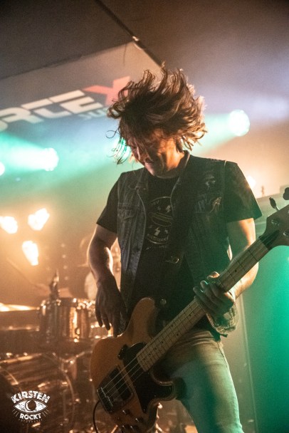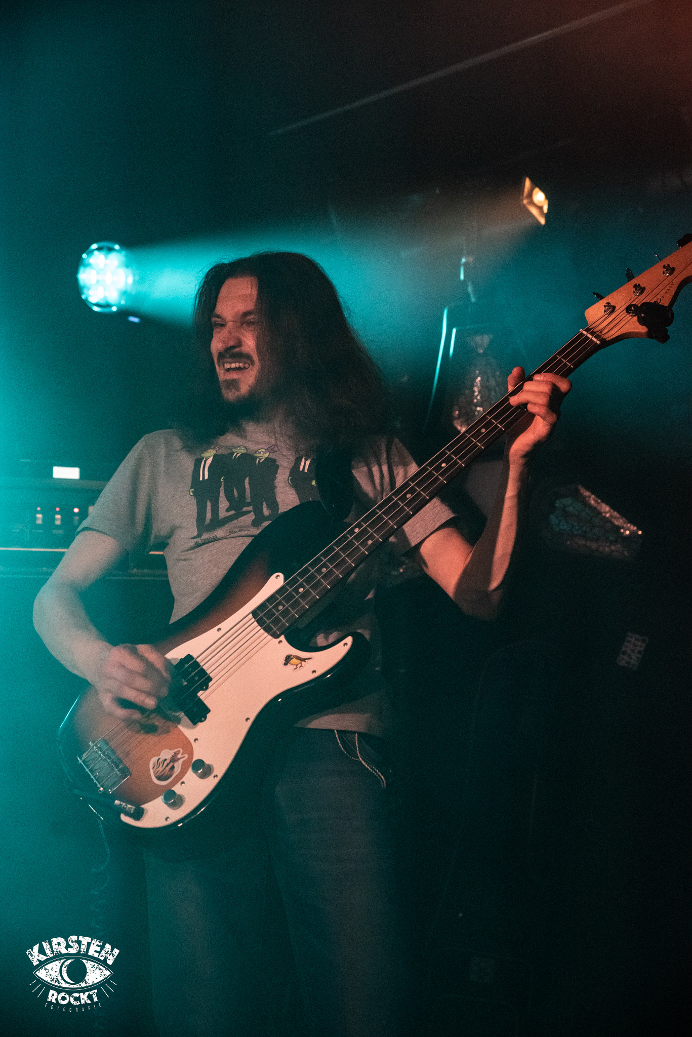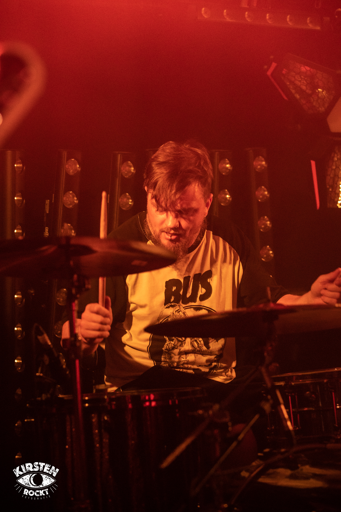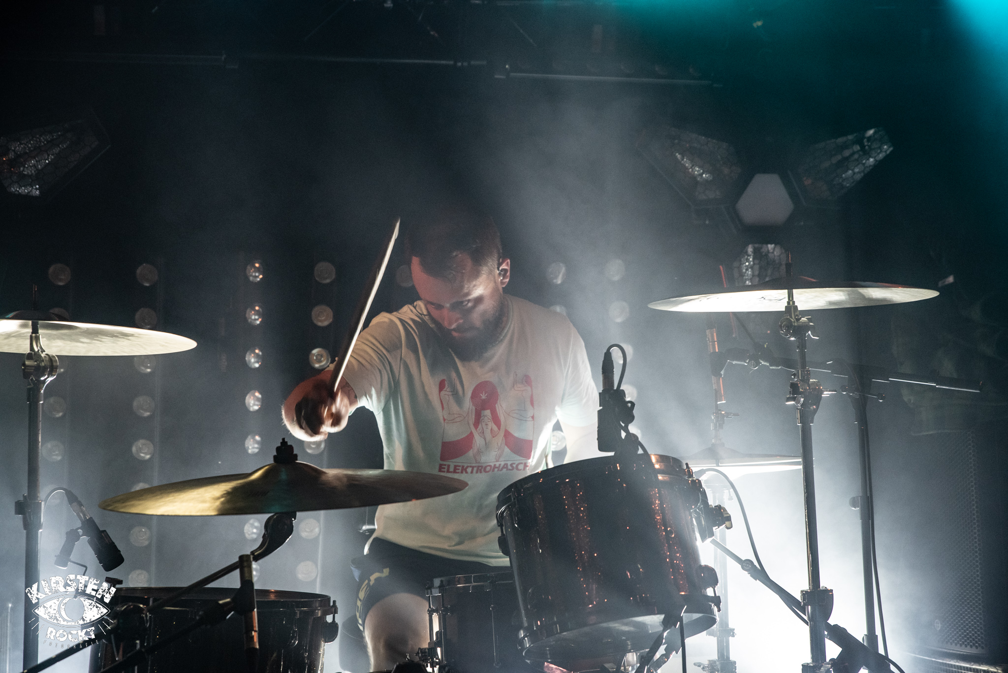 Langsam wird es enger und wärmer im Konzertraum. „Sightwaster“ vom 2016er Album „The Sun“ erscheint nun in deutlich schnellerem Tempo, leichte Aggressivität löst die vorangegangene Schwere ab. Beinahe schon verzweifelt brüllt Ihor seine wenigen Worte in dem ansonsten instrumentalen Stück in die Welt hinaus, die Menge gröhlt entsprechend mit im abschließenden Applaus. Eine authentische und vielversprechende Band, die getrost und gerne mit mehr Selbstvertrauen die Bühnen betreten darf. Als ich im Anschluss an das Konzert nach der Setlist frage, rennt Bassist Artur Savluk freudestrahlend in den Backstage-Raum und drückt mir anschließend sichtlich stolz zwei beschriftete Kartondeckel in die Hand. Begeistert schwärmt Artur, dass von den bisherigen fünf Konzerten das heutige im Vortex das beste gewesen sei.