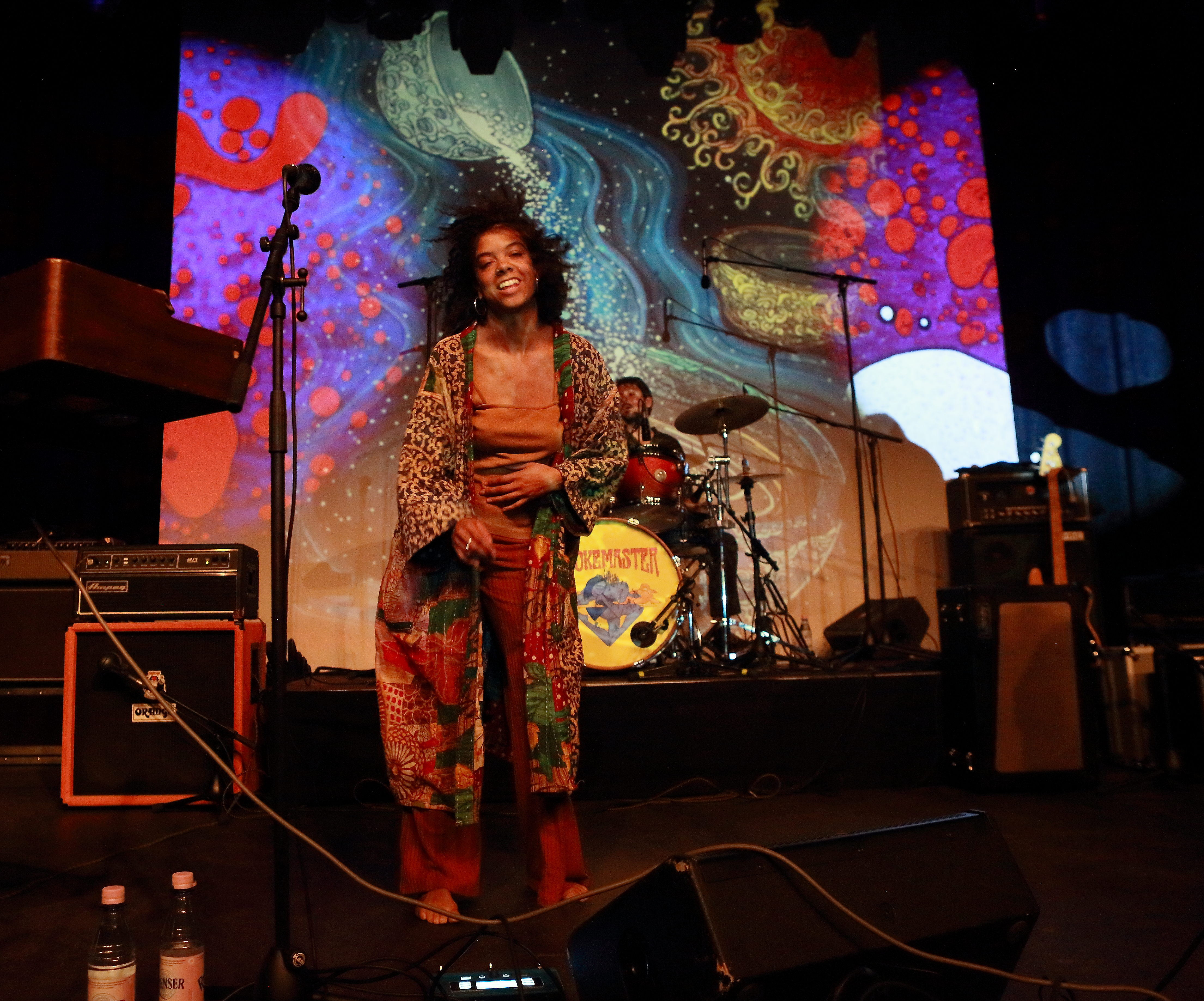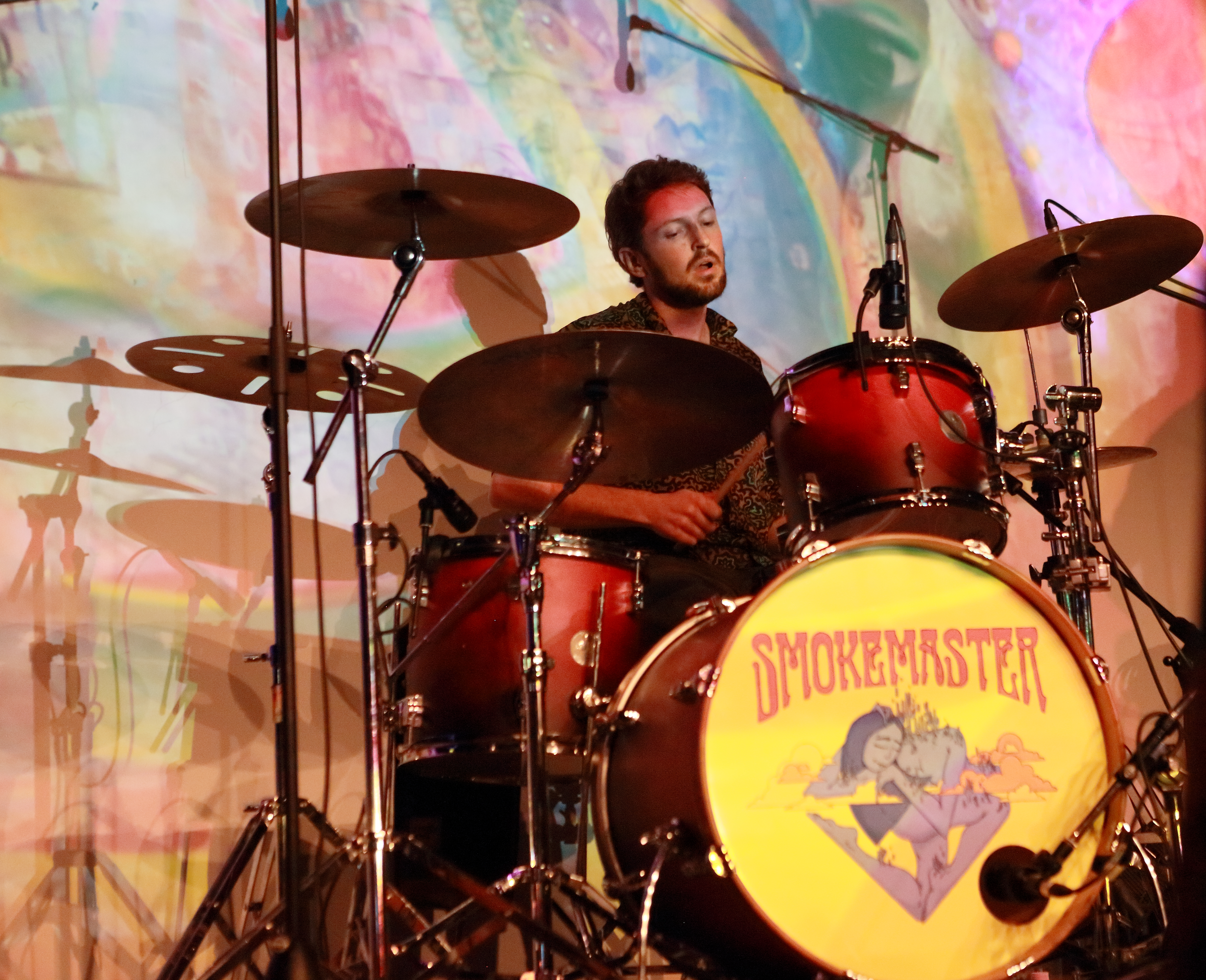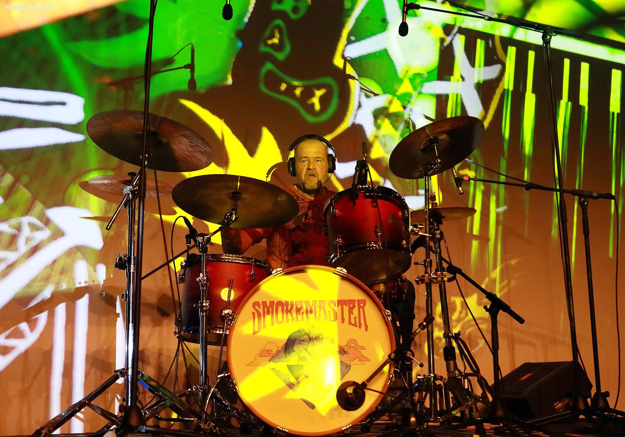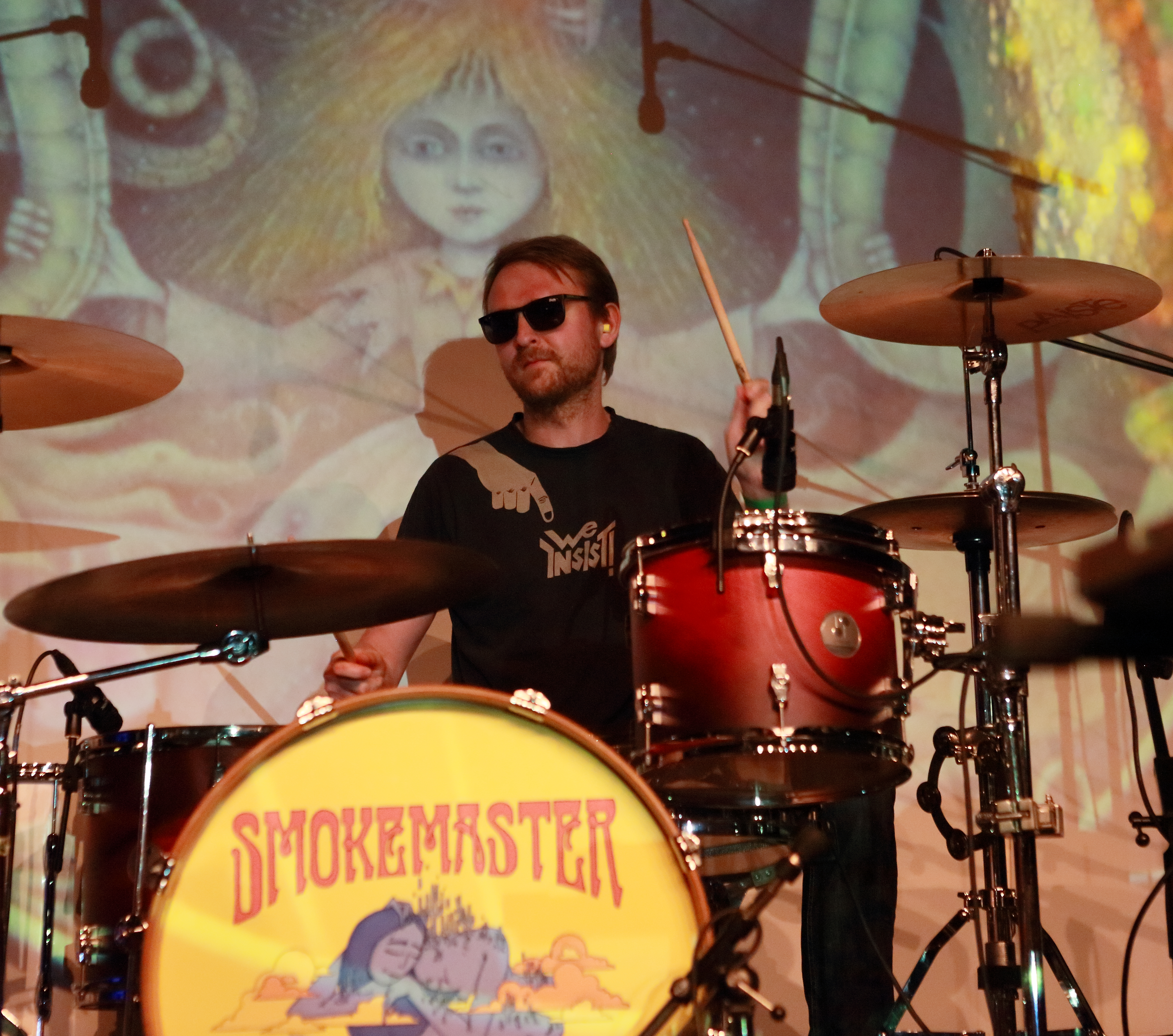 Die Band mit der kürzesten Anreise, Smokemaster aus Köln, legten uns danach einen sehr dicht gewebten Teppich aus schwerster, schwerer und auch luftig leichter Psychedelic, manchmal experimentell, manchmal krautig, manchmal hörste sie an die Pink Doors klopfen, und auch eine Reise in Zeit und Raum gönnten sie sich und uns, herrlich. Zwei Gitarren, mächtig und gewaltig und filigran orgelnde Tasten, Groove aus Bass und Schlagwerk wie die Sau. Ich sah sie damals vor der Pandemie zum ersten Mal in einer Kneipe in Köln-Kalk und war damals schon beeindruckt und hoffte das das was wird…..Und? Aber sowas von. Das wird in Zukunft ´ne große Hausnummer in der Szene, davon bin ich immer mehr überzeugt. Die Master rauchten mit uns eine Tüte nach der anderen, und zusammen mit dem Rausch der Visuals und der Musik entstand ein Kunstwerk nicht für Bares für Rares sondern Freakiges für Freaks. Danke!