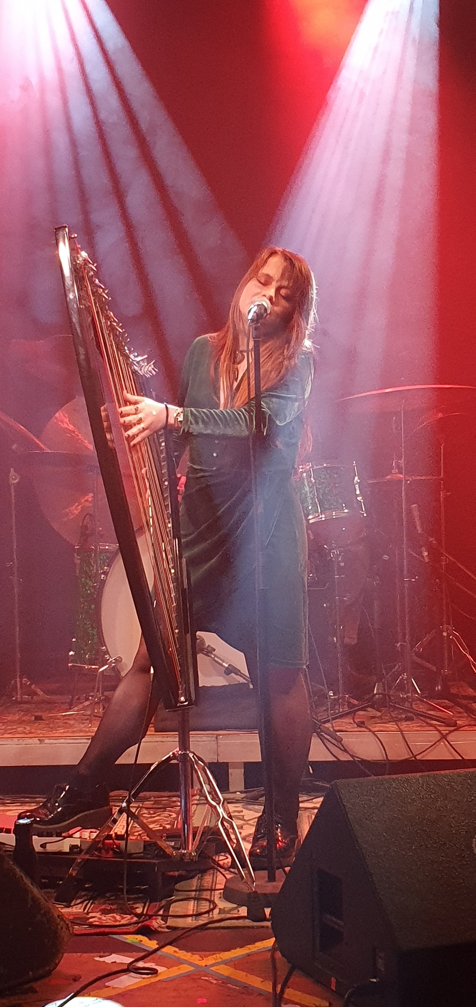 Im Zentrum des Spektakels steht Chloé Panhaleux mit ihrer E-Harfe und sie wechselt mit beeindruckender Leichtigkeit zwischen melancholischen Momenten und brutalen Wutattacken, die sie sowohl stimmlich als auch auf der Harfe gen Publikum schleudert. Dabei begibt sie sich gerne auch mal direkt ins Auditorium, steigt von der Bühne und nimmt direkten Kontakt mit dem ein oder anderen erstaunten Zuhörer auf, wirft sich auf den Boden, um kurze Zeit später plötzlich völlig entspannt wieder auf der Bühne zu stehen und in fast perfektem Deutsch äußerst sympathisch mit dem Publikum zu kommunizieren.