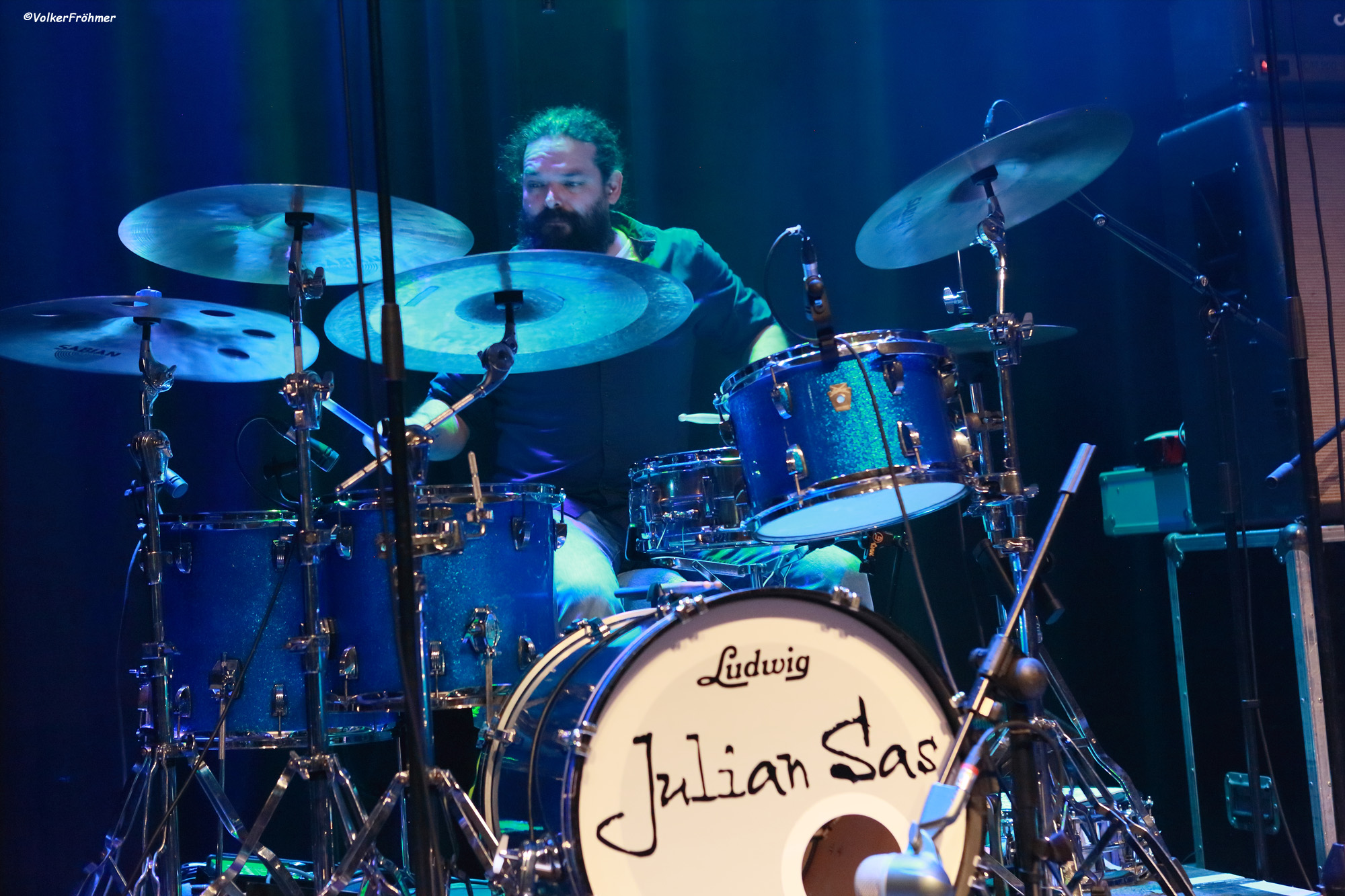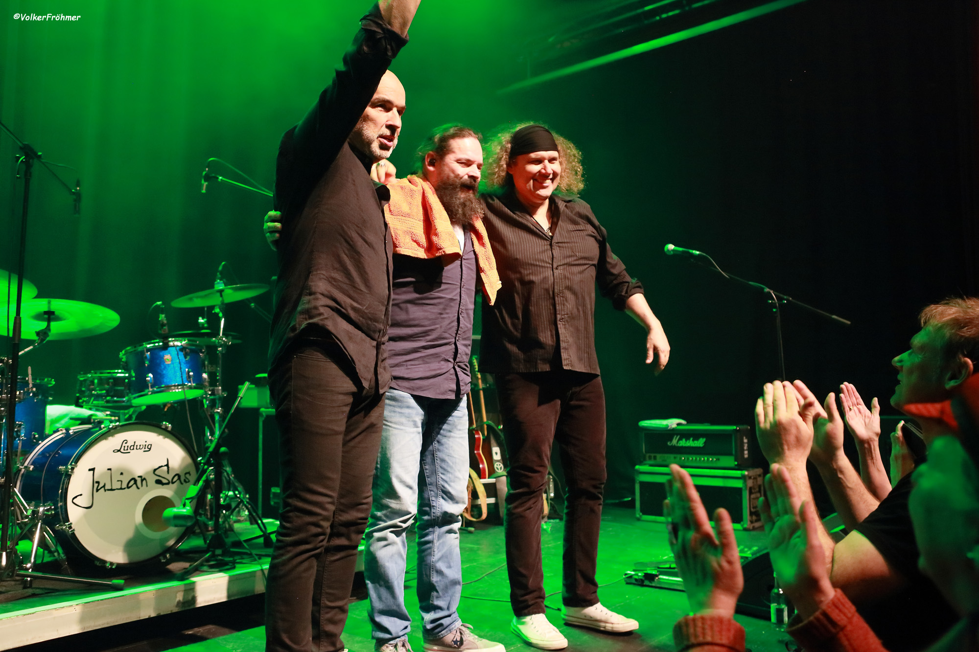 (vo) Seit Ende der 1990er hab ich Julian Sas und seine jeweiligen Bands bestimmt 15 mal live erlebt und es war immer, ohne Ausnahme, eine Vollbedienung in Sachen Blues, Bluesrock und Boogie, mit tiefster Inbrunst, Soul, Spielfreude noch und nöcher, und einem Gitarrenbearbeitungskönnen das in den schon genannten Musikuniversen seinesgleichen sucht. In einer für mich neuen Bandkonstellation erlebte ich an diesem Abend im Bürgerzentrum Köln-Nippes eine Veranstaltung, die Kumpel Maik Credner organisierte und die sehr guten Zuspruch in Sachen Publikumsgunst erfuhr: recht so und wunderbar! Zuletzt sah ich die Band als Quartett 2018 im LCB Wuppertal, heute als Trio. Durch den Tod von Basser Fotis (R.I.P.) und den Ausstiegen von Roland-Tasten und Rob-Schlagzeug formierte Julian mit Basser Edwin van Huik und Schlagwerker Lars-Eric van Elzakker ein sehr versiertes Duo um sich, die beiden sorgen für den unwiderstehlichen Groove und Punch für seine lauten und leisen Gitarrensalven- und exkursionen.
