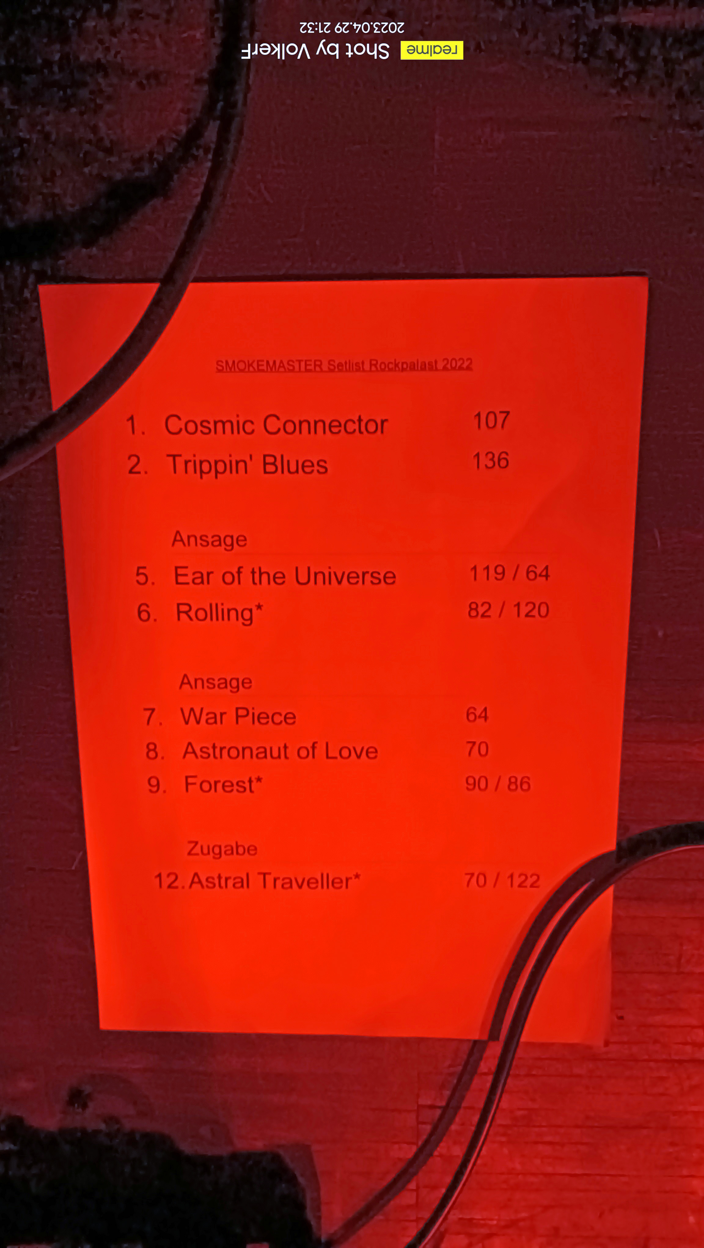 Ich möchte jetzt nicht jeden Song dieses zehnseitigen, mitreißenden Abends beschreiben denn das ein jeder für sich die Klasse dieser fünf Jungs unterstrich bewies auch der Zuspruch des Publikums, das begeistert mitfeierte. Doch einen möchte ich noch herausheben: mein Lieblingssong von ihnen war der siebte Streich, der „Astronaut Of Love“. Was für ein Monolith! Stonermäßig eingeläutet geht es voran: es werden wirklich alle Doors sperrangelweit in bester Smokemaster Manier geöffnet, was für eine Psychedelicmachtdemonstration! Die Jungs hatten großen Spaß unter- und miteinander genau wie das Volk vor der Bühne, es war uns ein Fest!