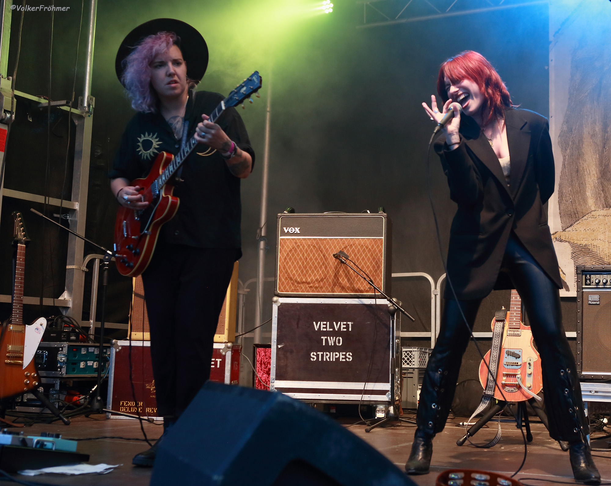 Sophie röhrt, kratzt und beißt mit ihrer rothaarigen Stimme, rotzig und rockig, ihre Schwester Sara brilliert als phänomenale Gitarristin, die besonders dann noch besser als gut ist wenn die von ihr erzeugten Töne im Gleichklang mit ihrer Gesichtsmimik voranschreiten. Beider Freundin Franca groovt an den vier Saiten wie die Hölle und treibt zusammen mit dem Schlagwerk (männlich) die Chose voran. Velvet Two Stripes sind mittlerweile sehr stark angesehen in der Szene, und sowas von verdient, die vier rockbluesen oder umgekehrt den Kellberg in den langsam verbleichenden Abend……wieder mal ein super Auftritt einer Schweizer Vorzeigecombo!