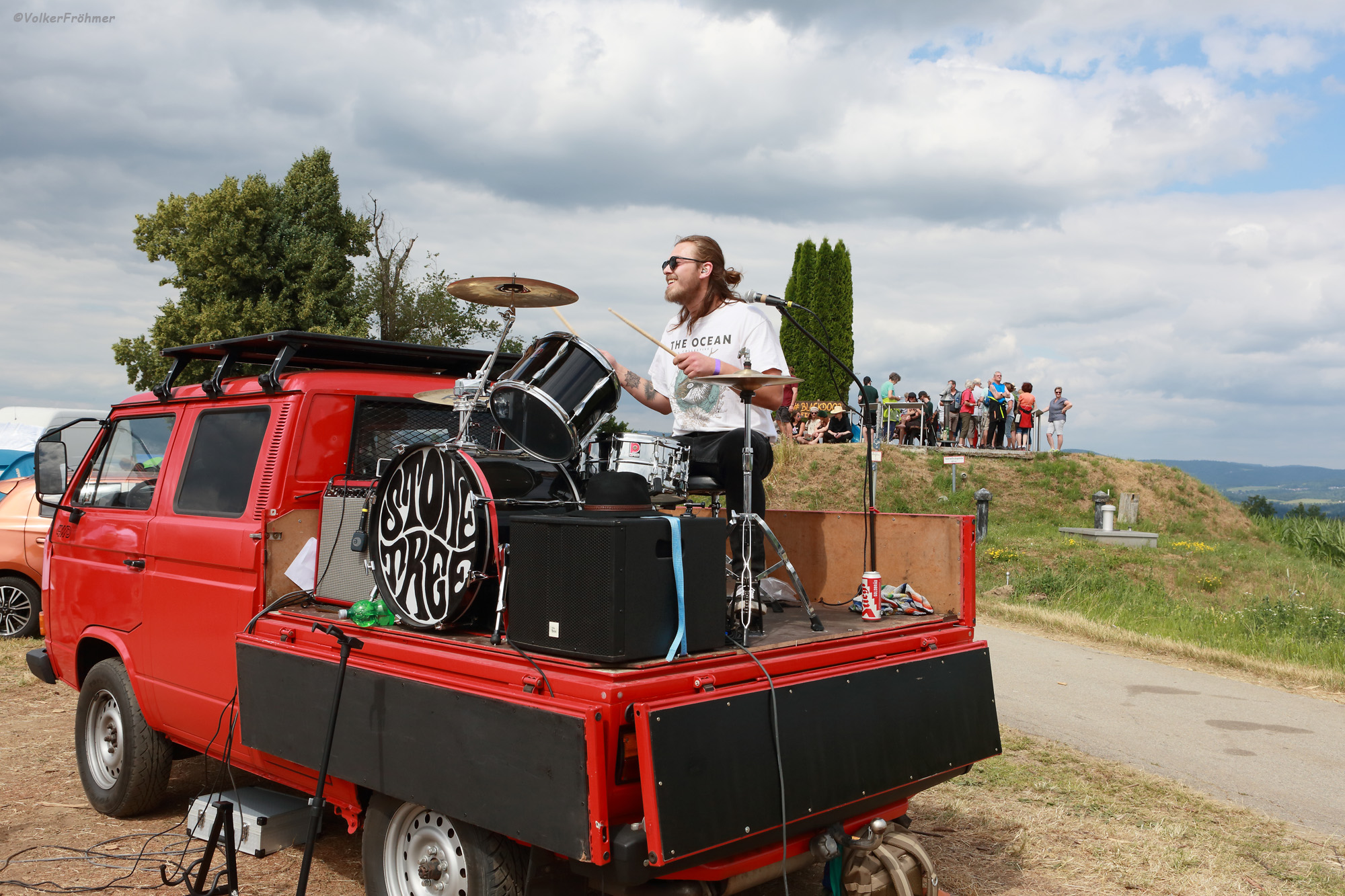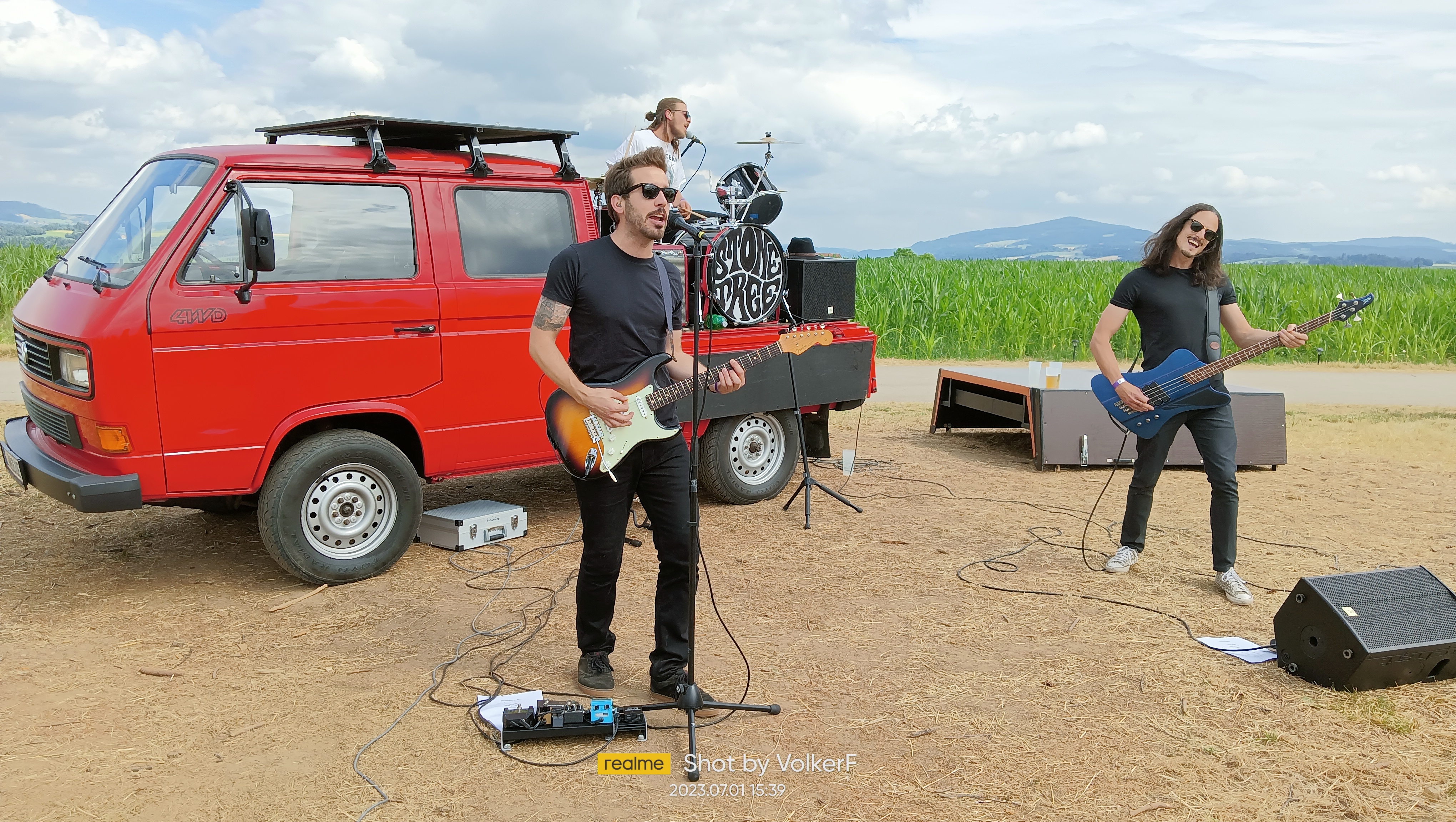 Heavy ging es weiter mit einem hart rockenden Volkswagen T 3 Pritsche und deren Besitzern: Stonetree aus Gmunden in Österreich zelebrierten ihren Sound aus Alternative-Grunge-Stoner vor dem Festeingang und spielten den vorhandenen, untergründigen Boden wuschelig. Übrigens war das Trio Christof, Christoph und Daniel auch schon in unserem Blog zu Gast (siehe hier). 45 Minuten Kurzweil mit federnder Pritsche, kernigem Gesang, kerniger Gitarre und wummerndem Bass erfreute uns, das Hörvolk, was für ein Schmankerl…..