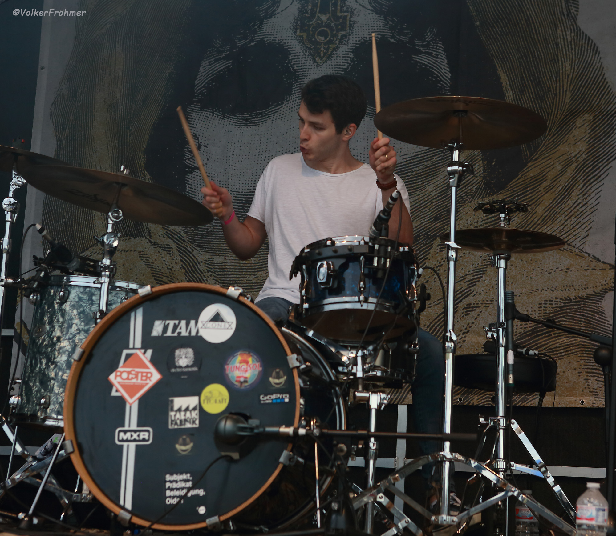 Die Umbaupause für das Berliner Quintett The Ocean Collective war reichlich bemessen, da musste programmiert und gestimmt werden und photographisch musste ich mir keinen Kopf machen: mit Bühnennebel kämpfe ich vorne nur ganz kurz und dann nicht mehr, also weiter nach hinten, Kamera für ein paar Schüsse in die Hand genommen und dann den Auftritt geniessen…..wie oben zum Titelbild schon formuliert: der krönende, ambientbombastische, apokalyptische, doomende, growlende, atmosphärischexstatische, Postmetallischbrachiale und Atemberaubende Abschluß des Festes, mit dramaturgischer Vollendung der gehörten Musik durch das neblige Ambiente, perfekt!