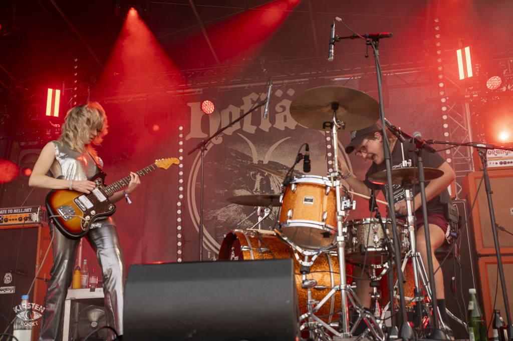 Earth Tongue – (KiS) Oh. Oh wie jung… oh was für ein süßes Duo! Beide aus Neuseeland hergedüst im Sauseschritt, wie der schmucke silberne Zweiteiler der Sängerin nahelegt. Ihr ist übrigens auf dem Flug nach Deutschland die Gitarre abhanden gekommen, doch sie konnte sich hier glücklicherweise eine Klampfe von einem Bandkollegen leihen. Der Drummer erinnert mich spontan an meinen jugendlichen Fotonachhilfelehrer. Aber da ist nix mit Topfdeckelschlagen oder so – der junge Mann betreibt sein Schlagstockspiel mit explosivem Wums an den richtigen Stellen. Also irgend ein Dentist hat doch hier an der Festival-Setlist gedreht… Earth Tongue, Zahn ersetzen Kvinna, Samstag noch Old Horn Tooth …zzz …wo ist nur dieser verdammte Zahnarzt aus Düsseldorf? – War mir die Band völlig unbekannt, fällt es mir wie Konfetti aus den Haaren, das ist die Vorband, die demnächst im Club Volta vorspielt. Vor Greenleaf. Feine Sache, da freue ich mich drauf. Bildergalerie.