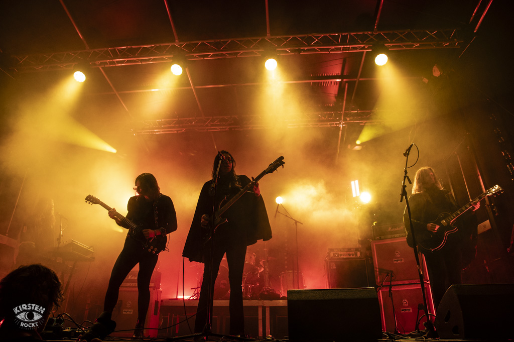 Hällas – (KiS) Diese Gäste auf der Bühne haben sich wirklich angemessen schick gemacht. Make up aufgelegt und geben der Hoflärm Geburtstagsparty den stylischen Flair. Leider, leider sieht man später gar nichts mehr davon. Denn: Dunkelheit und Nebel umfangen die Truppe wie ein Samtenes Mäntelchen. Dabei passt der „Neue“ – Rickard an Gitarre Nr.2 wunderbar ins Gesamtbild der Band. (Er war aber auch schon beim Freak Valley Festival am Start, falls er einigen doch schon vertraut vorkam). Die Herren aus Schweden wirbeln auf der Bühne, während mir nur Klischées durchs Hirn schwurbeln. Småland, Ikea, Michel von Lönneberga, Pipi Langstrumpf, ah verdammt. Zu diesen meinen Kindheitserinnerungen lassen die Klänge vergangener Zeiten als Untermalung einen bleibenden Eindruck. Epic!