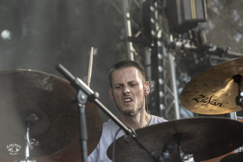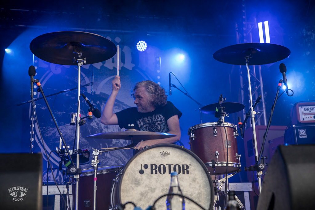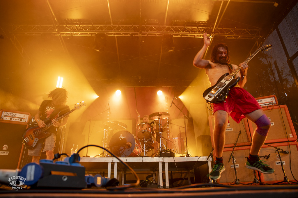 Rotor – (ju) Es gibt Bands, die feiern eine wilde Party auf der Bühne und gehen ab wie die Lutzi auf Speed (zum Beispiel Truckfighters, s.u.). Auf der anderen Seite der Skala gibt es Bands, die durch ihr hochkonzentriertes, höchst versiertes (Zusammen-)Spiel völlig in ihrer Musik aufgehen und stets in tiefer Verbindung mit den Bandkollegen stehen. Den drei Herren von Rotor sieht man die Konzentration und Versiertheit deutlich an. Hier sind Profis am Werk, keine Frage. Rotor = Motor. Antrieb zum Wippen, zum Bangen, zum Taumeln, zur Ekstase. Das instrumentale Stoner-Prog-Trio aus Berlin weiß an diesem Nachmittag trotz oder gerade wegen seiner hochkomplexen Rhythmen und Tempiwechsel die Massen zu begeistern und zugleich zu hypnotisieren. Ihr erfrischend unkonventioneller Sound ist vielschichtig, unvorhersehbar und unfassbar punktgenau. Wenn sich Schlagzeug, Bass und Gitarre unterschiedliche, scheinbar gegensätzliche Rhythmen zuspielen und manche Passage im Stakkato-Gewitter erzittert, denke ich unweigerlich an Tool. Rotor ist eine dieser Bands, bei denen mir der Mund offensteht. Normalerweise zu viert unterwegs, müssen die Herren derzeit wegen gesundheitlicher Gründe auf ihren Gitarristen Martin verzichten, was ihre Leistung jedoch nicht vermindert und umso beachtlicher erscheinen lässt.