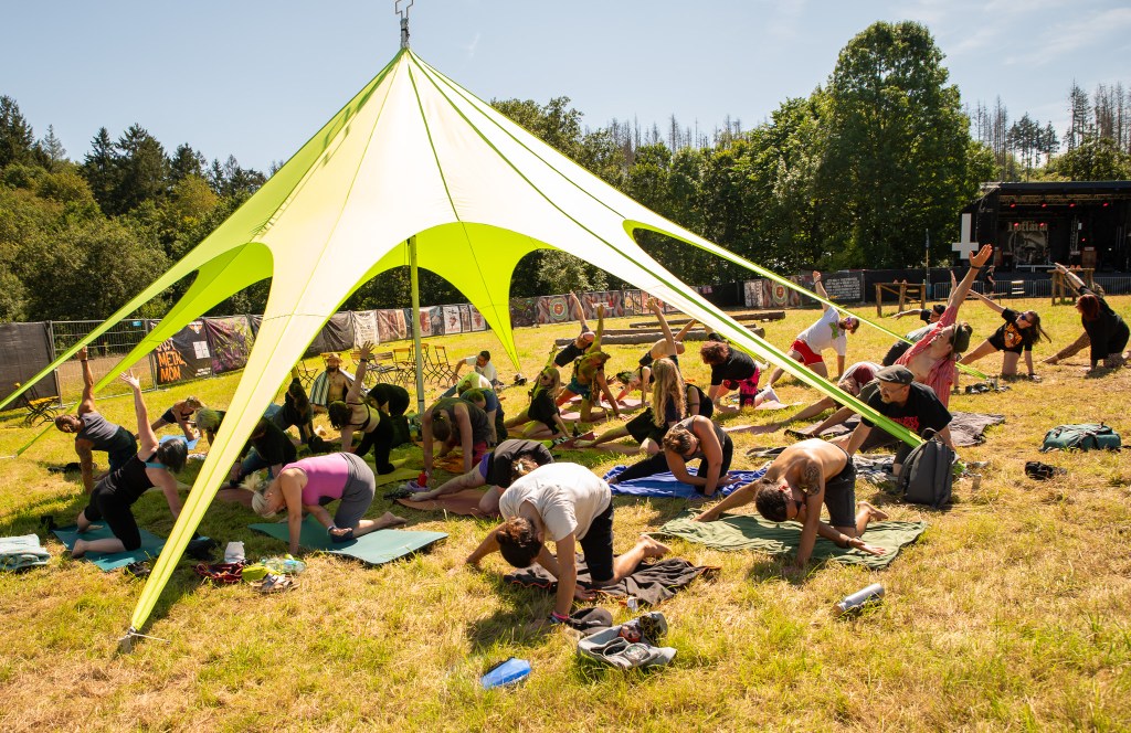 Hoflärm Yoga – (KiS) Freitagmittag, kurz vor eins. Statt Topfschlagen und Blinde Kuh gibt es zum fünfjährigen Geburtstag dieses Jahr Yoga auf dem Festivalgelände. Die süße Judith, O-Ton: „Hab ein bisschen Angst, dass keiner kommt.“ Was sie nicht weiß: Es stehen bereits ein paar Leute vor dem verschlossenen Eingang, doch als dieser geöffnet wird, sind alle verschwunden. Dann trudelt ein fröhliches Dutzend durch den Backstage-Bereich hinein und sucht sich einen Platz auf einer der 13 bereitliegenden Matten unter dem hellgrünen Sternenzelt oder breitet die eigens mitgebrachte Matte aus. Judith startet ihre Playlist und alle begeben sich in die Kindspose, als kurz darauf Caspar herbeigeeilt kommt und darauf hinweist, dass noch mehr Leute kommen. Am Ende verteilen sich 37 Leute auf Matten und im Gras, im Schatten des Sternenzeltes und unter der prallen Sonne. Sämtliche Asanas und Flows sind auf die neun Lieder abgestimmt – alles Songs von Bands, die dieses Jahr hier auf dem Festival spielen. Die Gruppe wärmt sich auf zu Rotors „Costa Verde“, fließt zu „Strong Reflection“ von Mars Red Sky durch den Sonngengruß, bangt ausgelassen die Köpfe zu „My First Knife Fight“ von Swan Valley Heights und verschmilzt am Ende mit dem warmen Boden, von Speck ins „Firmament“ getragen. Namasté, war das geil! Judith glücklich und überwältigt, die Teilnehmenden so begeistert, dass sie am liebsten Samstagmorgen wieder Yoga machen wollen. Eine Wiederholung 2024 scheint damit zementiert!