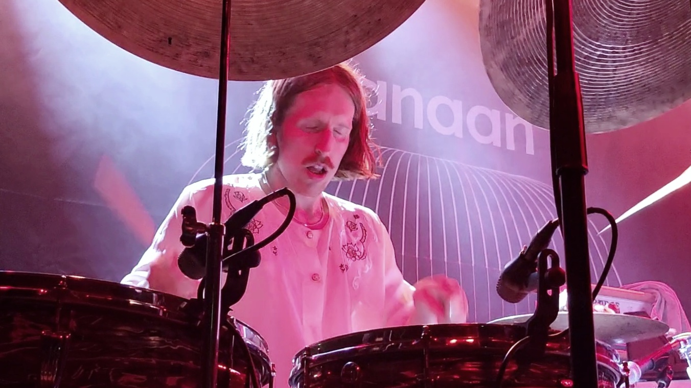 Nach nur drei Songs ist mittlerweile fast eine Dreiviertelstunde wie im Flug vergangen, und als man sich schon fragt, wie die Band diese Energieleistung denn bloß bis zum Ende des Gigs durchhalten soll, kündigt Ingvald (übrigens in hervorragendem Deutsch, denn wie ich später erfahre ist seine Mutter in Deutschland gebürtig) einen selten oder bisher nie gespielten Song „speziell für Euch“ an und es folgt mit „Softly Through Sunshine“ dankenswerterweise ein ruhigeres Stück vom sechsten Studioalbum „Diversions Vol. 1“, das Kanaan 2022 unter Mitwirkung des jungen Jazzpianisten Håvard Ersland aufgenommen hat. Der Hochdruck der vorausgegangenen drei Stücke hat jedoch Spuren beim Equipment hinterlassen, denn gegen Ende des Songs reißt das Fell der Basedrum (das muss man auch erstmal schaffen in der Kürze der Zeit!), was die Band dazu veranlasst, nach „Softly“ eine zehnminütige Reparaturpause einzulegen – keiner im Publikum will das wirklich, aber jeder einzelne kann es definitiv sehr gut gebrauchen!