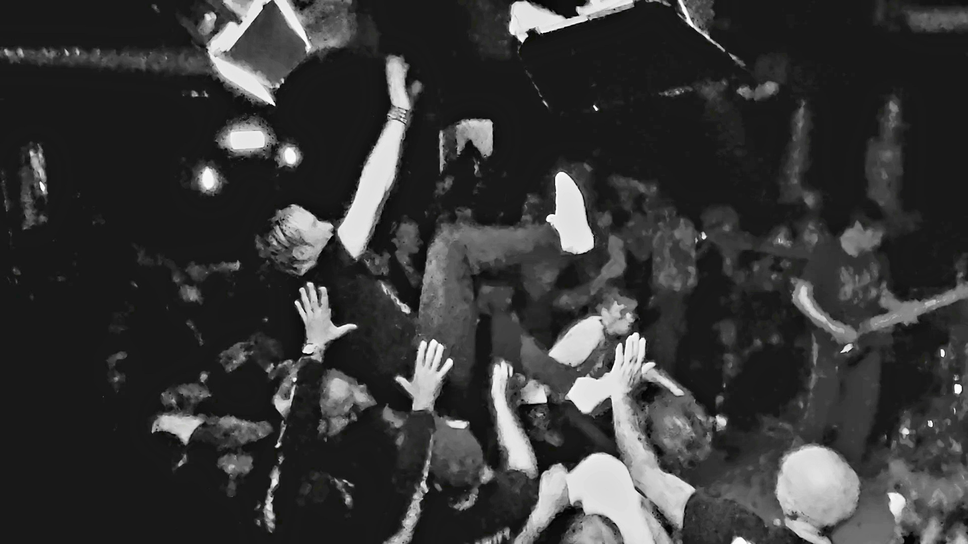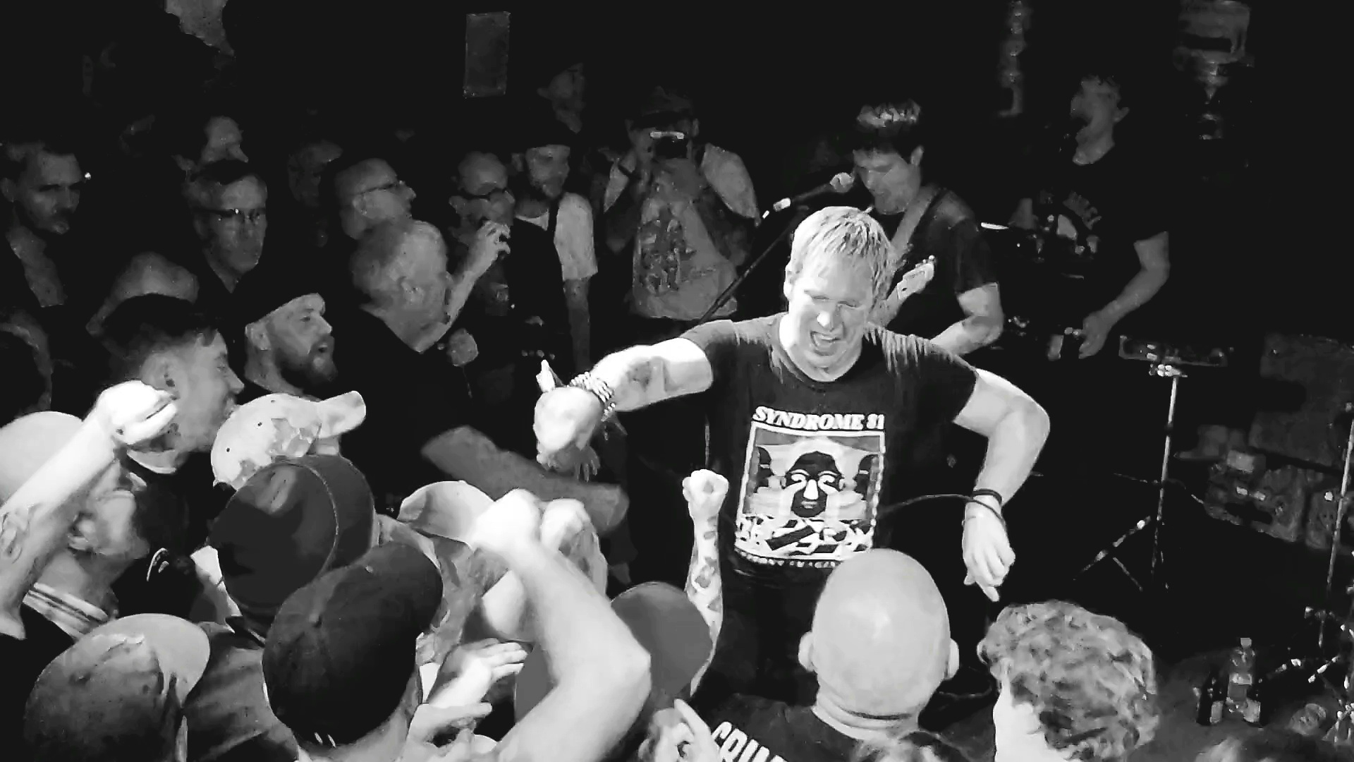 Selten habe ich derart viel Energie auf der Bühne und im Publikum erlebt wie am heutigen Abend. McKinnon springt, luftkickboxt und rennt unaufhörlich über die kleine Bühne und die teils catchy Synthie-Melodien, die man vom Vinyl gewohnt ist, sind zwar irgendwo vorhanden, werden aber hier und heute deutlich von einer reinen und höchstenergetischen Punk-Attitüde weit in den Hintergrund gestellt. Selbst mein persönlicher Favorit „Overtime“, den der Sänger zuvor allen kürzlich verstorbenen geliebten Menschen des Publikums und der Band widmet, gerät phasenweise zu einer „Mitten-in-die Fresse-Power-Ballade“. Die beiden äußerst Joy Division verliebten Stücke „Flaw In The Design“ von ihrer EP und „End Transmission“ von „Games Of Power“ lassen eine Welle von (und hier zitiere ich einen Begriff aus einem Review der Zeitschrift Vision, der einfach passt wie die berühmte Faust aufs Auge) „Wavegaze“ auf das Publikum los, die Tanzwut des Publikums ist entfacht – und spätestens bei den zwei textlich sehr politikkritischen Stücken „Faded State“ und „Nation“ löst eine positiv chaotische Bewegungsexplosion die zuvor genannte Tanzwut ab und bricht um in wildes Getümmel vor der Bühne: angestachelt von McKinnons aggressiven Hardcore-Vocals, bei denen er immer wieder gerne das Mikro direkt in die Gesichter der Frontrow hält, springen und rennen nun auch die ersten fünf Reihen vor der Bühne herum, werfen sich ins und aufs Publikum, crowdsurfen und zappeln in Ekstase. McKinnon selbst wirft sich beim letzten Song vor der Zugabe mit voller Wucht ins Publikum, wird kurz auf Händen durch die Menge getragen und dann schnell wieder für die nächsten Lyrics auf die Bühne zurück verfrachtet. Die Temperatur an diesem mit 10 Grad einigermaßen milden Novembertag ist in der Trompete mittlerweile auf einen heißen Sommertag angestiegen, und der Schweiß läuft selbst im Stehen in Strömen.