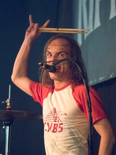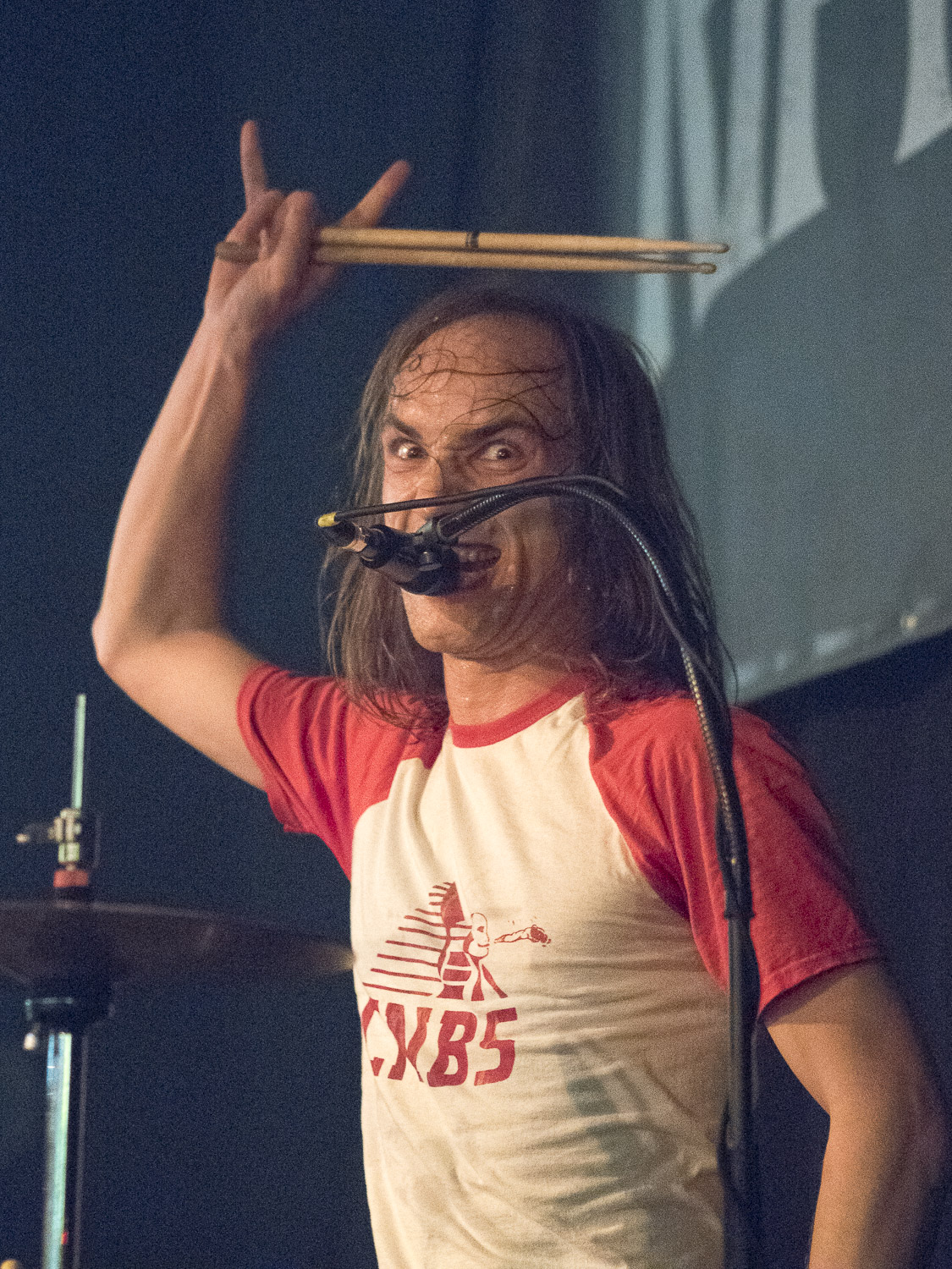 Als perfekt gewählter Opener begannen die Cannabineros aus Berlin, Igor Suvorov an der Gitarre und am Bass und Sascha Höltge singend und entertainend an den Drums. Schon die ersten Töne des Soundtracks der Liebe, wie die Cannabineros ihre Musik nennen, drückte die Menge brachial an die Wand. Säsh und Igor lieferten eine fette Mischung aus Punk, Rock, Stoner und Psychedelic, welche das Publikum augenblicklich in Bewegung setzte. Selbst die Barhockerhocker in der letzten Reihe waren mindestens zum Mitnicken gezwungen. Das lag vor allem an Säsh´s unübersehbarer Spielfreude und seinem grandios kreativem Spielwitz an den Kesseln. Selbst eine vom Podest rutschende Hi-Hat und ein umfallendes Mikrofonstativ hielten Säsh nicht davon ab, während der Songs weiter in die Bassdrum zu metern und seine Becken zu malträtieren.