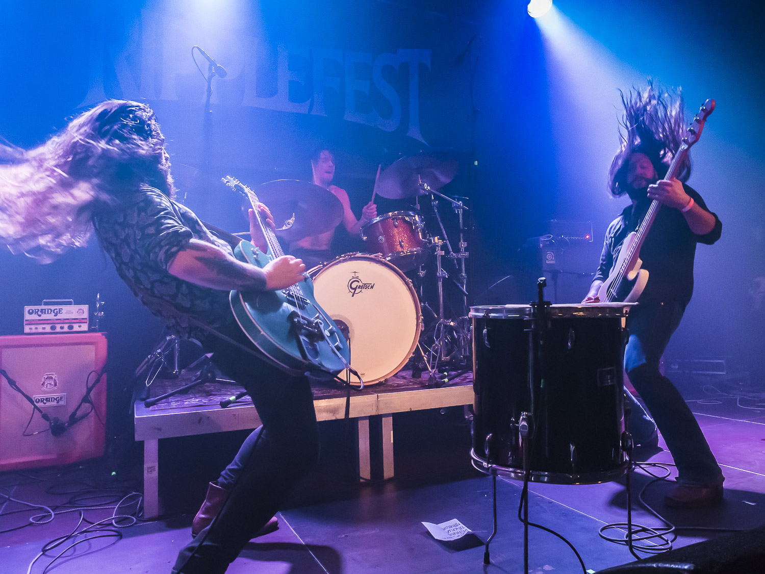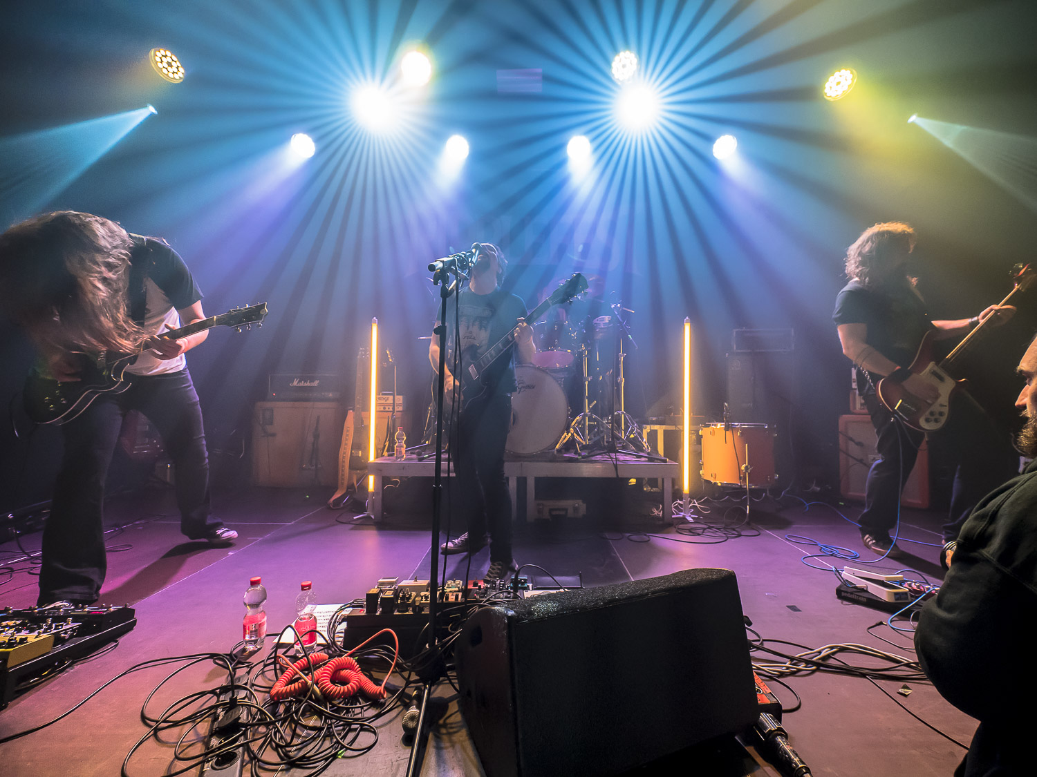 Die optischen Holzfäller aus Brest, Frankreich, hatten einen derartig drückenden Sound, dass es den FOH während des Konzertes gefühlt einen Meter nach hinten schob. Früher zu viert, heute als Trio unterwegs, bestehen Appalooza aus Tony Kerdoncuff (Bass) Vincent Kermagoret (Drums) Sylvain Morel (Guitar, Vocals). Auf dem ersten selbstveröffentlichtem Album „Appalooza“ aus dem Jahr 2018 ist Tony noch als Gitarrist zu hören. Die Einflüsse von Kyuss, Queens oft the Stone Age und Baroness waren in Appaloozas Heavy Rock hör- und spürbar. Sylvains Gretsch mit Tripple Humbucker dröhnte, dass es eine Freude war. Sein teils episch-melodiöser, an Chris Cornell erinnernder Gesang stand im Kontrast zu seinem rifflastigen Gitarrenspiel, beides zusammen ergab einen düster-mysteriösen Klang. Der tieft gedroppte Bass trieb jedes Stück unaufhaltsam voran wie eine Dampfwalze, dass die Saiten nur so dahinschlabberten, während Vincent ein wildes aber tightes Spiel am Schlagzeug ablieferte.