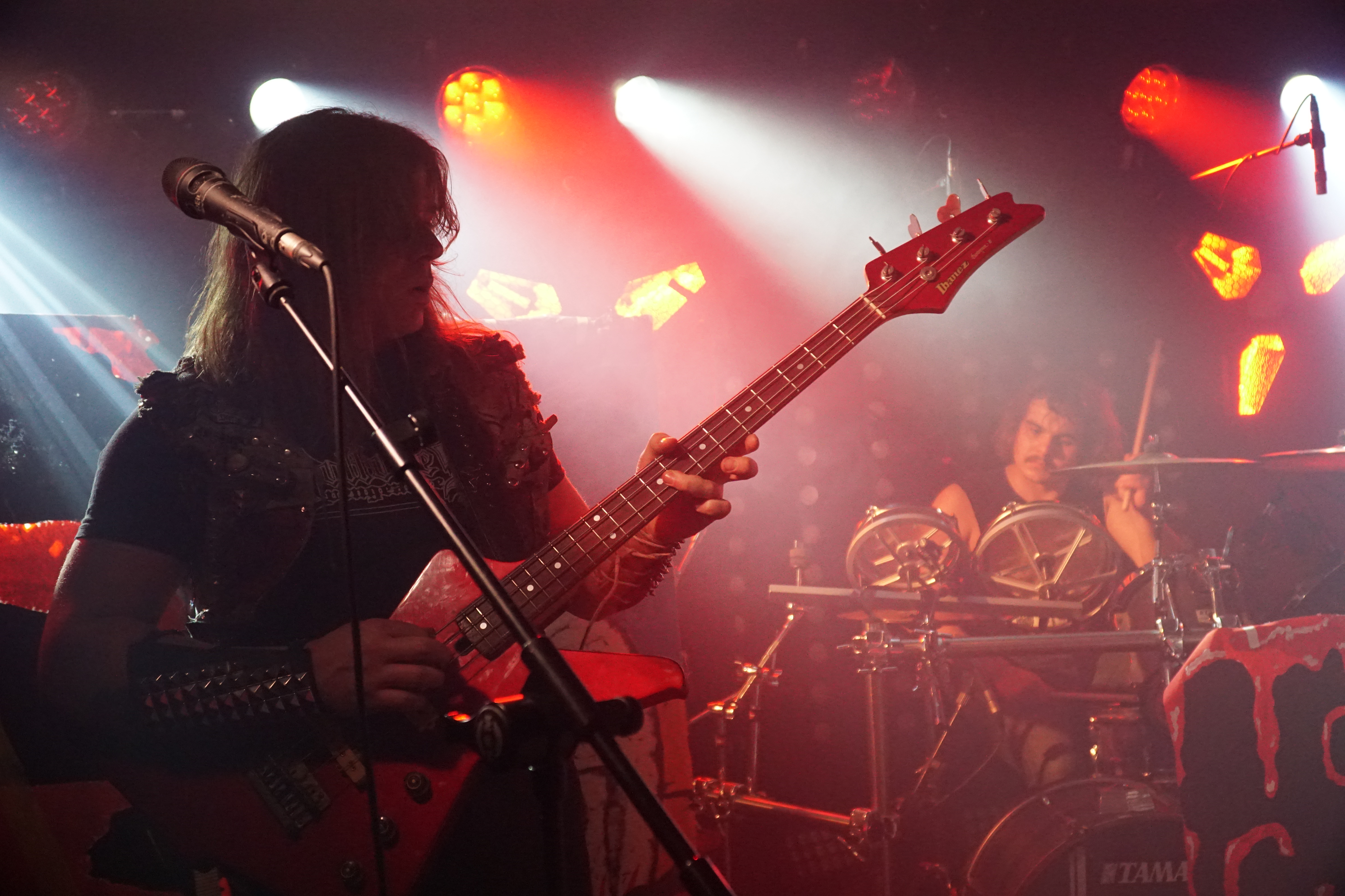 Zunächst einmal werden wir mit einem mächtigen Arschtritt zurück in den Ruhrpott der achtziger Jahre katapultiert, als uns die drei Haudraufdegen von SPHINX in weißen Basketballsneakers, fetten Patronengurten und Nieten-Armschienen authentisch derben, herrlich rohen Thrash und Speed Metal um die Ohren jagen, ganz im Geiste der frühen Kreator, Sodom und Destruction. Passenderweise kommen Terrorizer (Gitarre), Bonebreaker (Drums) und Aggressor (Bass und Vocals) aus dem Ruhrpott, genauer gesagt aus Gelsenkirchen. Die Vortex-Bühne ist geschmückt mit selbst gestalteten Kunstwerken, die u.a. in blutiger Schrift verkündigen, dass Siegen heute Abend zerfleddert werden wird. SPHINX geben dazu alles mit ihrem infernalen Riffgewitter und Texten über Krieg, Mord und Zerstörung. „Massacre Of Siegen“ quasi, statt „Massacre Of Distomo“. Die Fans in der ersten Reihe sind mit einem Fuß auf dem Bühnenrand nicht nur standsicher beim Bangen und Fäuste-in-die-Luft-Werfen, sondern auch textsicher und unterstützen den abwechslungsreichen, teils zweistimmigen Gesang von Bassist und Hauptsänger Aggressor sowie Saitenbuddy Terrorizer mit treuer Leidenschaft.